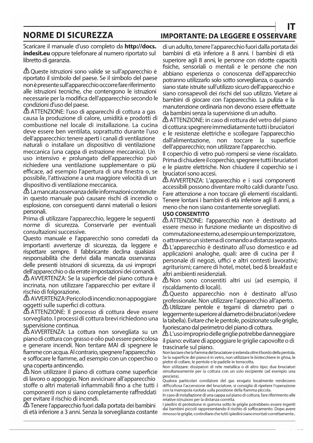 FRScaricare il manuale d’uso completo da http://docs. indesit.eu oppure telefonare al numero riportato sul libretto di garanzia. Queste istruzioni sono valide se sull’apparecchio è riportato il simbolo del paese. Se il simbolo del paese non è presente sull’apparecchio occorre fare riferimento alle istruzioni tecniche, che contengono le istruzioni necessarie per la modica dell’apparecchio secondo le condizioni d’uso del paese. ATTENZIONE: l’uso di apparecchi di cottura a gas causa la produzione di calore, umidità e prodotti di combustione nel locale di installazione. La cucina deve essere ben ventilata, soprattutto durante l’uso dell’apparecchio: tenere aperti i canali di ventilazione naturali o installare un dispositivo di ventilazione meccanica (una cappa di estrazione meccanica). Un uso intensivo e prolungato dell’apparecchio può richiedere una ventilazione supplementare o più ecace, ad esempio l’apertura di una nestra o, se possibile, l’attivazione a una maggiore velocità di un dispositivo di ventilazione meccanica. La mancata osservanza delle informazioni contenute in questo manuale può causare rischi di incendio o esplosione, con conseguenti danni materiali o lesioni personali. Prima di utilizzare l’apparecchio, leggere le seguenti norme di sicurezza. Conservarle per eventuali consultazioni successive. Questo manuale e l’apparecchio sono corredati da importanti avvertenze di sicurezza, da leggere e rispettare sempre. Il fabbricante declina qualsiasi responsabilità che derivi dalla mancata osservanza delle presenti istruzioni di sicurezza, da usi impropri dell’apparecchio o da errate impostazioni dei comandi. AVVERTENZA: Se la supercie del piano cottura è incrinata, non utilizzare l’apparecchio per evitare il rischio di folgorazione. AVVERTENZA: Pericolo di incendio: non appoggiare oggetti sulle superci di cottura. ATTENZIONE: Il processo di cottura deve essere sorvegliato. I processi di cottura brevi richiedono una supervisione continua. AVVERTENZA: La cottura non sorvegliata su un piano di cottura con grasso e olio può essere pericolosa e generare incendi. Non tentare MAI di spegnere le amme con acqua. Al contrario, spegnere l’apparecchio e soocare le amme, ad esempio con un coperchio o una coperta antincendio. Non utilizzare il piano di cottura come supercie di lavoro o appoggio. Non avvicinare all’apparecchio stoe o altri materiali inammabili no a che tutti i componenti non si siano completamente rareddati per evitare il rischio di incendi. Tenere l’apparecchio fuori dalla portata dei bambini di età inferiore a 3 anni. Senza la sorveglianza costante di un adulto, tenere l’apparecchio fuori dalla portata dei bambini di età inferiore a 8 anni. I bambini di età superiore agli 8 anni, le persone con ridotte capacità siche, sensoriali o mentali e le persone che non abbiano esperienza o conoscenza dell’apparecchio potranno utilizzarlo solo sotto sorveglianza, o quando siano state istruite sull’utilizzo sicuro dell’apparecchio e siano consapevoli dei rischi del suo utilizzo. Vietare ai bambini di giocare con l’apparecchio. La pulizia e la manutenzione ordinaria non devono essere eettuate da bambini senza la supervisione di un adulto. ATTENZIONE: in caso di rottura del vetro del piano di cottura: spegnere immediatamente tutti i bruciatori e le resistenze elettriche e scollegare l’apparecchio dall’alimentazione, non toccare la supercie dell’apparecchio; non utilizzare l’apparecchio. Il coperchio di vetro può rompersi se viene riscaldato. Prima di chiudere il coperchio, spegnere tutti i bruciatori e le piastre elettriche. Non chiudere il coperchio se i bruciatori sono accesi. AVVERTENZA: L’apparecchio e i suoi componenti accessibili possono diventare molto caldi durante l’uso. Fare attenzione a non toccare gli elementi riscaldanti. Tenere lontani i bambini di età inferiore agli 8 anni, a meno che non siano costantemente sorvegliati. USO CONSENTITO ATTENZIONE: l’apparecchio non è destinato ad essere messo in funzione mediante un dispositivo di commutazione esterno, ad esempio un temporizzatore, o attraverso un sistema di comando a distanza separato. L’apparecchio è destinato all’uso domestico e ad applicazioni analoghe, quali: aree di cucina per il personale di negozi, uci e altri contesti lavorativi; agriturismi; camere di hotel, motel, bed & breakfast e altri ambienti residenziali. Non sono consentiti altri usi (ad esempio, il riscaldamento di locali). Questo apparecchio non è destinato all’uso professionale. Non utilizzare l’apparecchio all’aperto. Utilizzare pentole e tegami di diametro pari o leggermente superiore al diametro dei bruciatori (vedere la tabella). Evitare che le pentole, posizionate sulle griglie, fuoriescano dal perimetro del piano di cottura. L’uso improprio delle griglie potrebbe danneggiare il piano: evitare di appoggiare le griglie capovolte o di trascinarle sul piano. Non lasciare che la amma del bruciatore si estenda oltre il bordo della pentola.Se la supercie del piano è in vetro, non utilizzare le bistecchiere in ghisa, le pietre di collare, le pentole e le padelle in terracotta.Non utilizzare: dissipatori di rete metallica o di altro tipo; due bruciatori simultaneamente per la cottura con un solo recipiente (ad esempio una pesciera).Qualora particolari condizioni del gas erogato localmente rendessero dicoltosa l’accensione del bruciatore, si consiglia di ripetere l’operazione con la manopola ruotata sulla posizione della amma piccola.In caso di installazione di una cappa sul piano di cottura, fare riferimento alle relative istruzioni per la distanza corretta.I piedini di protezione in gomma sotto le griglie potrebbero essere ingeriti dai bambini piccoli rappresentando il rischio di soocamento. Dopo avere rimosso le griglie, controllare che tutti i piedini siano montati correttamente..