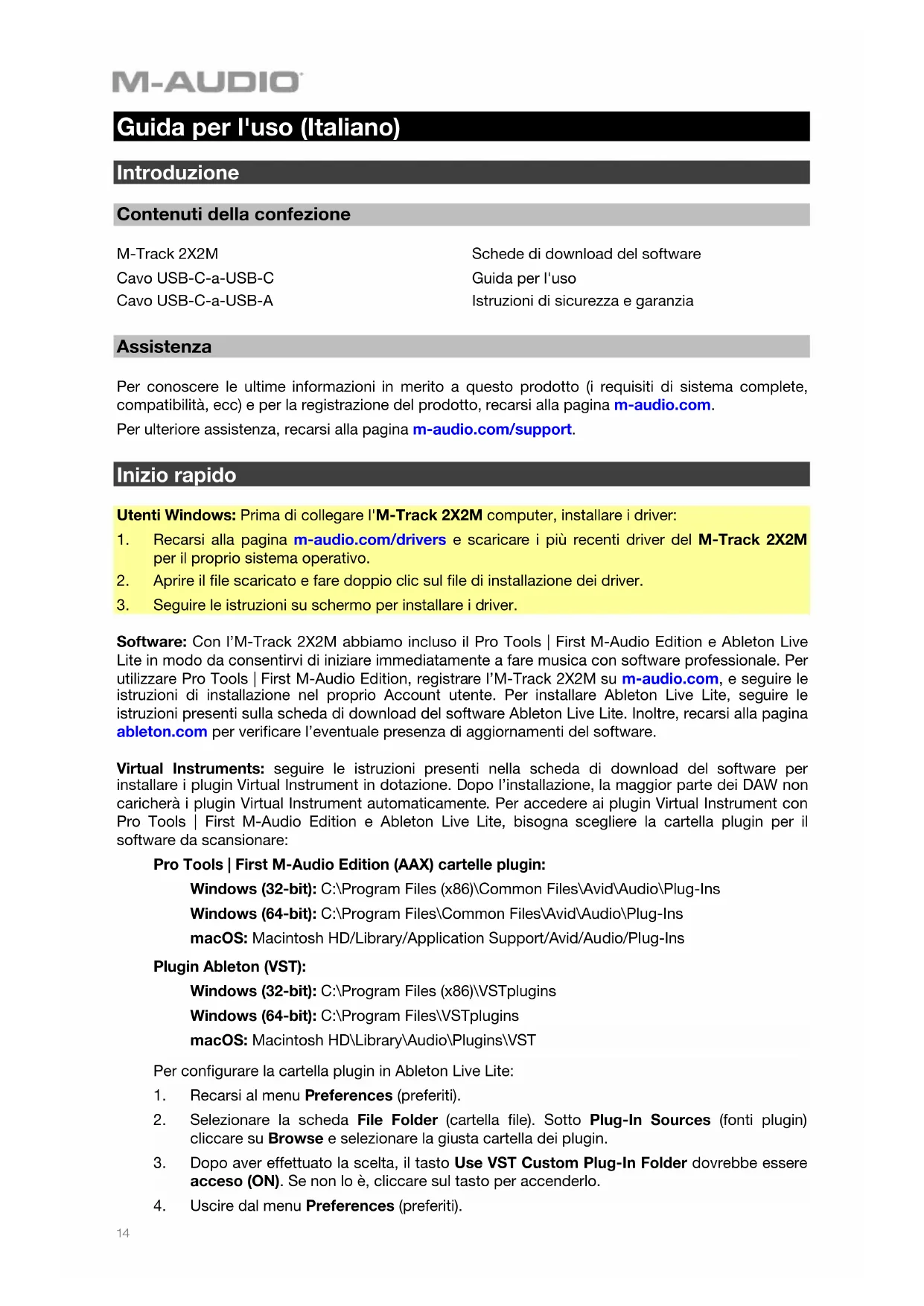 Software: Con l’M-Track 2X2M abbiamo incluso il Pro Tools | First M-Audio Edition e Ableton Live Lite in modo da consentirvi di iniziare immediatamente a fare musica con software professionale. Per utilizzare Pro Tools | First M-Audio Edition, registrare l’M-Track 2X2M su m-audio.com, e seguire le istruzioni di installazione nel proprio Account utente. Per installare Ableton Live Lite, seguire le istruzioni presenti sulla scheda di download del software Ableton Live Lite. Inoltre, recarsi alla pagina ableton.com per verificare l’eventuale presenza di aggiornamenti del software. Virtual Instruments: seguire le istruzioni presenti nella scheda di download del software per installare i plugin Virtual Instrument in dotazione. Dopo l’installazione, la maggior parte dei DAW non caricherà i plugin Virtual Instrument automaticamente. Per accedere ai plugin Virtual Instrument con Pro Tools | First M-Audio Edition e Ableton Live Lite, bisogna scegliere la cartella plugin per il software da scansionare: Pro Tools | First M-Audio Edition (AAX) cartelle plugin: Windows (32-bit): C:\Program Files (x86)\Common Files\Avid\Audio\Plug-Ins Windows (64-bit): C:\Program Files\Common Files\Avid\Audio\Plug-Ins macOS: Macintosh HD/Library/Application Support/Avid/Audio/Plug-Ins Plugin Ableton (VST): Windows (32-bit): C:\Program Files (x86)\VSTplugins Windows (64-bit): C:\Program Files\VSTplugins macOS: Macintosh HD\Library\Audio\Plugins\VST Per configurare la cartella plugin in Ableton Live Lite: