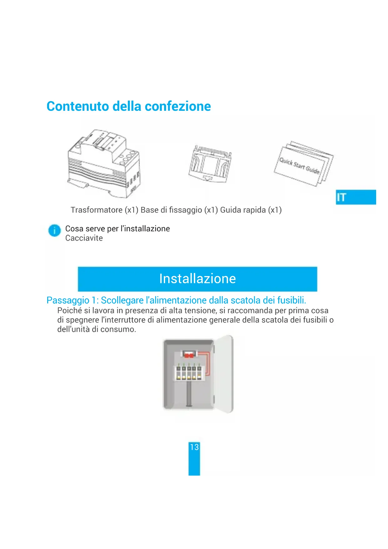 acheminer la tension de 12 V nécessaire à votre carillon de porte. L’installation nale devrait ressembler à celle gurant sur le schéma suivant. Entrée : 230 V CA 12 V CA vers la sonnette Sortie : 12 V CA Étape 4 : rétablissez l’alimentation au niveau du tableau électrique. Pour obtenir des informations détaillées, visitez le site www.ezviz.eu.13 Contenuto della confezione Trasformatore (x1) Base di ssaggio (x1) Guida rapida (x1) Cosa serve per l'installazione Cacciavite Installazione Passaggio 1: Scollegare l'alimentazione dalla scatola dei fusibili. Poiché si lavora in presenza di alta tensione, si raccomanda per prima cosa di spegnere l'interruttore di alimentazione generale della scatola dei fusibili o dell'unità di consumo.14 Passaggio 2: Individuazione del trasformatore del campanello esistente. Per un funzionamento corretto del campanello EZVIZ, è necessaria l'alimentazione CA a 12 V. Vericare che il trasformatore del campanello in uso soddis questo requisito. In caso contrario, lo sostituisca con quello incluso nella confezione. Qualora abbiate bisogno di assistenza per l'esecuzione di questa operazione o qualora nel paese di installazione sia illegale intervenire all’interno della scatola dei fusibili o dell’unità di consumo, contattare un elettricista qualicato. Il trasformatore dovrebbe trovarsi nella scatola dei fusibili o nell'unità di consumo. In caso contrario, cercare nelle altre posizioni in cui sono installati i componenti elettrici. Passaggio 3: Cablaggio del trasformatore.