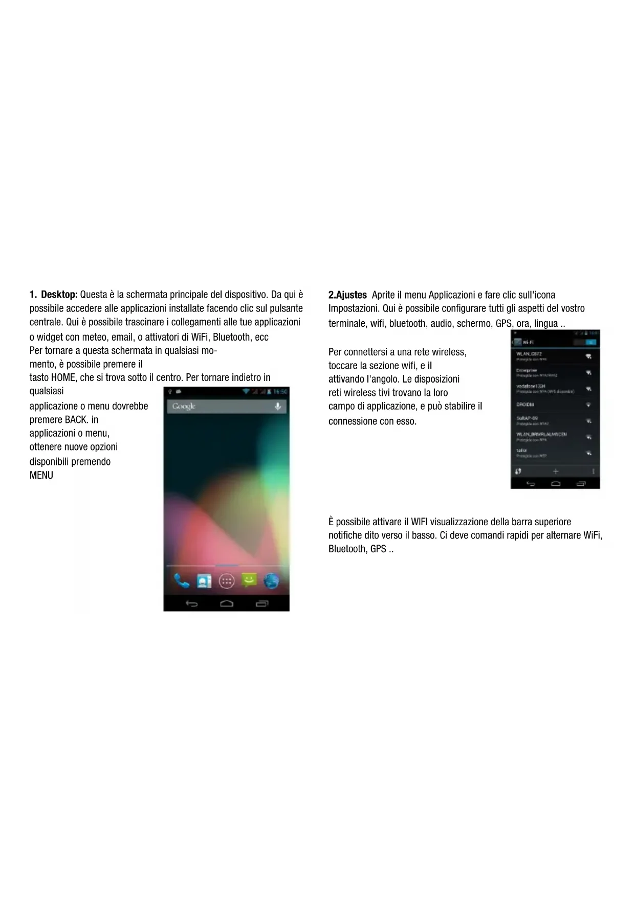 2.Ajustes Aprite il menu Applicazioni e fare clic sull'icona Impostazioni. Qui è possibile configurare tutti gli aspetti del vostro terminale, wifi, bluetooth, audio, schermo, GPS, ora, lingua .. Per connettersi a una rete wireless, toccare la sezione wifi, e il attivando l'angolo. Le disposizioni reti wireless tivi trovano la loro campo di applicazione, e può stabilire il connessione con esso.