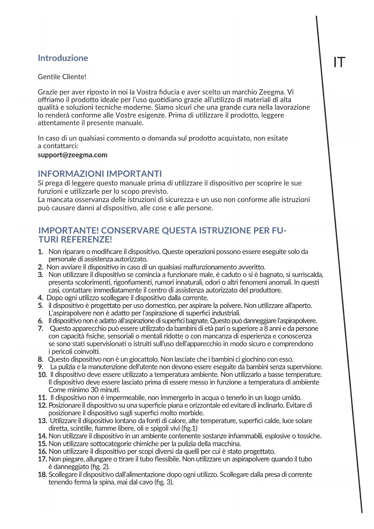 w uchwyt na odkurzaczu. Zdjęcia mają charakter poglądowy, rzeczywisty wygląd produktów może różnić się od prezentowanego na zdjęciach. Przycisk zwijania 1IT Introduzione Genle Cliente! Grazie per aver riposto in noi la Vostra ducia e aver scelto un marchio Zeegma. Vi oriamo il prodoo ideale per l’uso quodiano grazie all’ulizzo di materiali di alta qualità e soluzioni tecniche moderne. Siamo sicuri che una grande cura nella lavorazione lo renderà conforme alle Vostre esigenze. Prima di ulizzare il prodoo, leggere aentamente il presente manuale. In caso di un qualsiasi commento o domanda sul prodoo acquistato, non esitate a contaarci: support@zeegma.com INFORMAZIONI IMPORTANTI Si prega di leggere questo manuale prima di ulizzare il disposivo per scoprire le sue funzioni e ulizzarle per lo scopo previsto. La mancata osservanza delle istruzioni di sicurezza e un uso non conforme alle istruzioni può causare danni al disposivo, alle cose e alle persone.