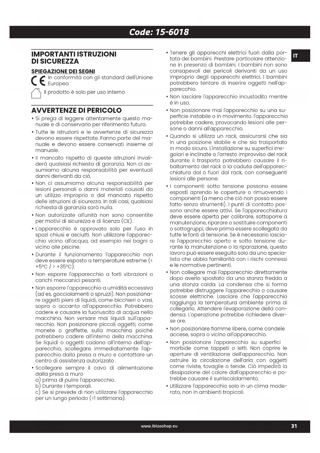 Questo simbolo indica che le batterie usate non devono essere smaltite con i riuti domestici, ma devono essere smal- tite correttamente in conformità con le norma- tive locali. Le batterie non devono essere esposte a calore eccessivo come luce solare, fuoco o simili. Se le batterie interne non devono essere utiliz- zate, rimuoverle per evitare danni dovuti a per- dite o corrosione. ATTENZIONE: pericolo di esplosione se la bat- teria viene sostituita in modo errato. Sostituire solo con lo stesso tipo o equivalente. AVVERTENZA: non ingoiare la batteria. Rischio di ustioni chimiche. Tenere le batterie nuove e usate fuori dalla portata dei bambini. Se il vano batteria non si chiude correttamente, smettere di utilizzare il prodotto e tenerlo fuori dalla portata dei bambini. In caso di dubbi sul fatto che le batterie siano state ingerite o introdotte in un'altra parte del corpo, consultare immediatamente un medico.Code: 15-6018