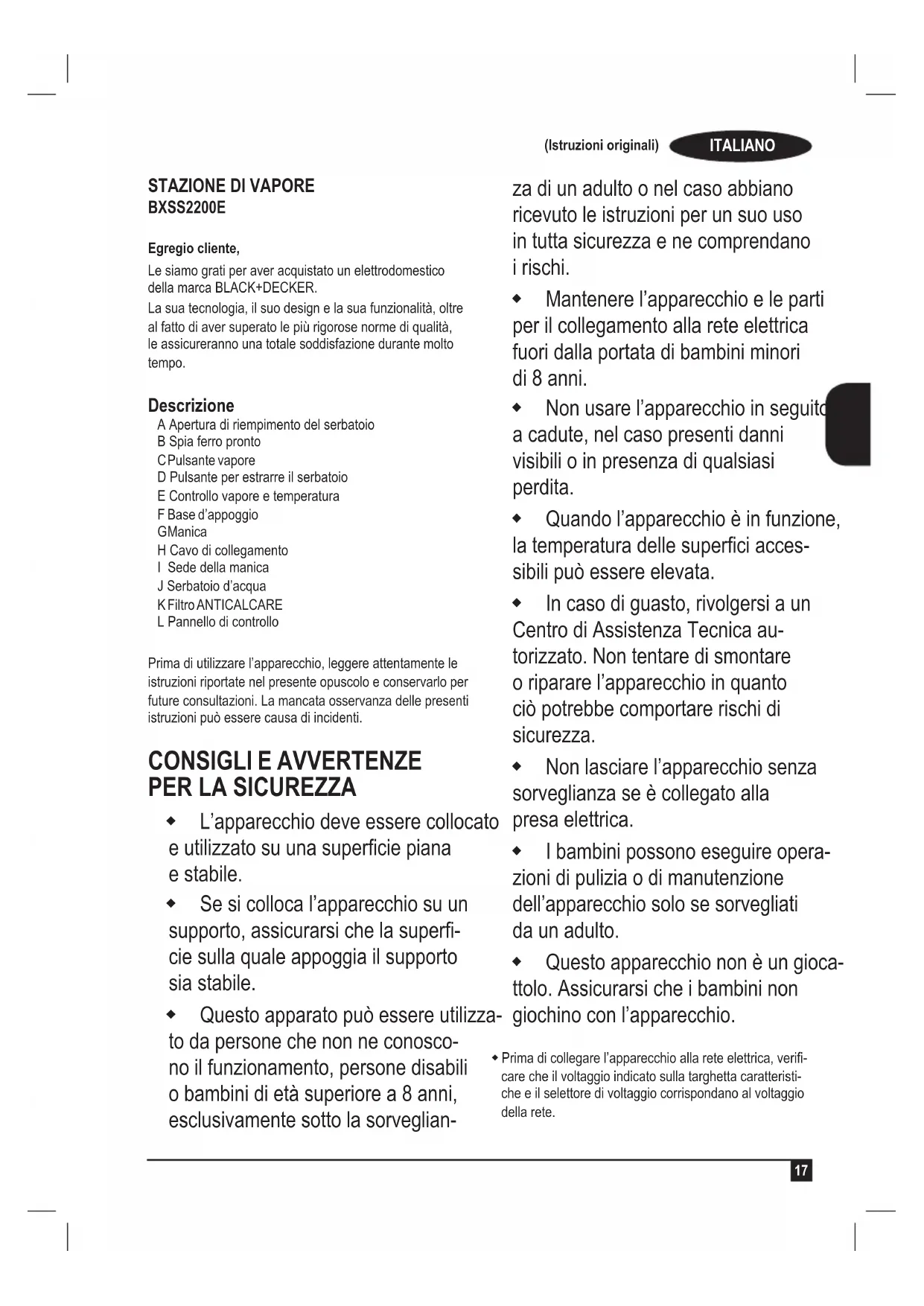 BXSS2200E Egregio cliente, Le siamo grati per aver acquistato un elettrodomestico della marca BLACK+DECKER. La sua tecnologia, il suo design e la sua funzionalità, oltre al fatto di aver superato le più rigorose norme di qualità, le assicureranno una totale soddisfazione durante molto tempo. Descrizione A Apertura di riempimento del serbatoio B Spia ferro pronto C Pulsante vapore D Pulsante per estrarre il serbatoio E Controllo vapore e temperatura F Base d’appoggio G Manica H Cavo di collegamento I Sede della manica J Serbatoio d’acqua K Filtro ANTICALCARE L Pannello di controllo Prima di utilizzare l’apparecchio, leggere attentamente le istruzioni riportate nel presente opuscolo e conservarlo per future consultazioni. La mancata osservanza delle presenti istruzioni può essere causa di incidenti.
