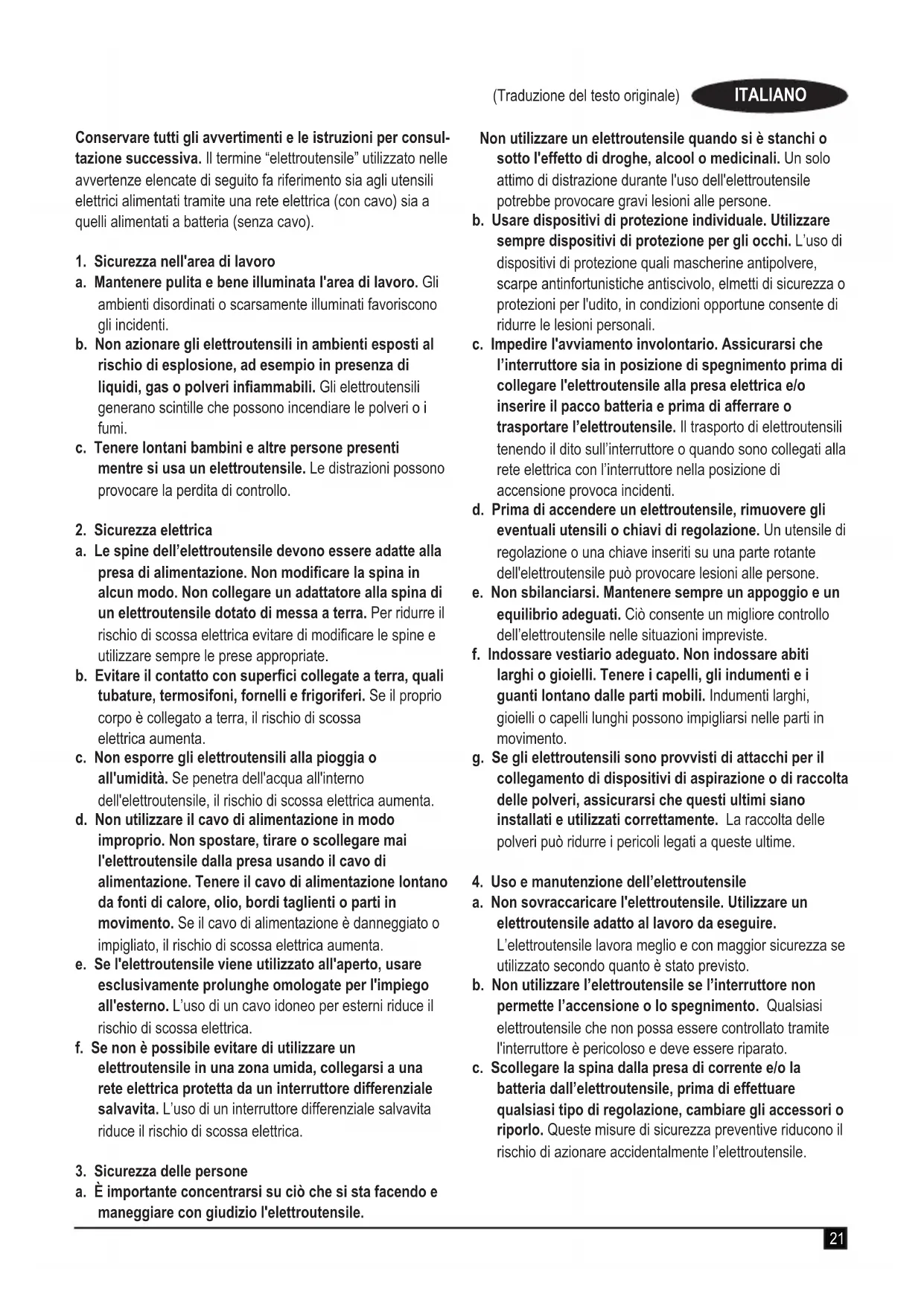 Avvertenza! Leggere attentamente tutte le avvertenze e le istruzioni di sicurezza. La mancata osservanza delle avvertenze e istruzioni elencate di seguito potrebbe dar luogo a scosse elettriche, incendi e/o lesioni gravi alle persone.21 (Traduzione del testo originale) ITALIANO Conservare tutti gli avvertimenti e le istruzioni per consul- tazione successiva. Il termine “elettroutensile” utilizzato nelle avvertenze elencate di seguito fa riferimento sia agli utensili elettrici alimentati tramite una rete elettrica (con cavo) sia a quelli alimentati a batteria (senza cavo).