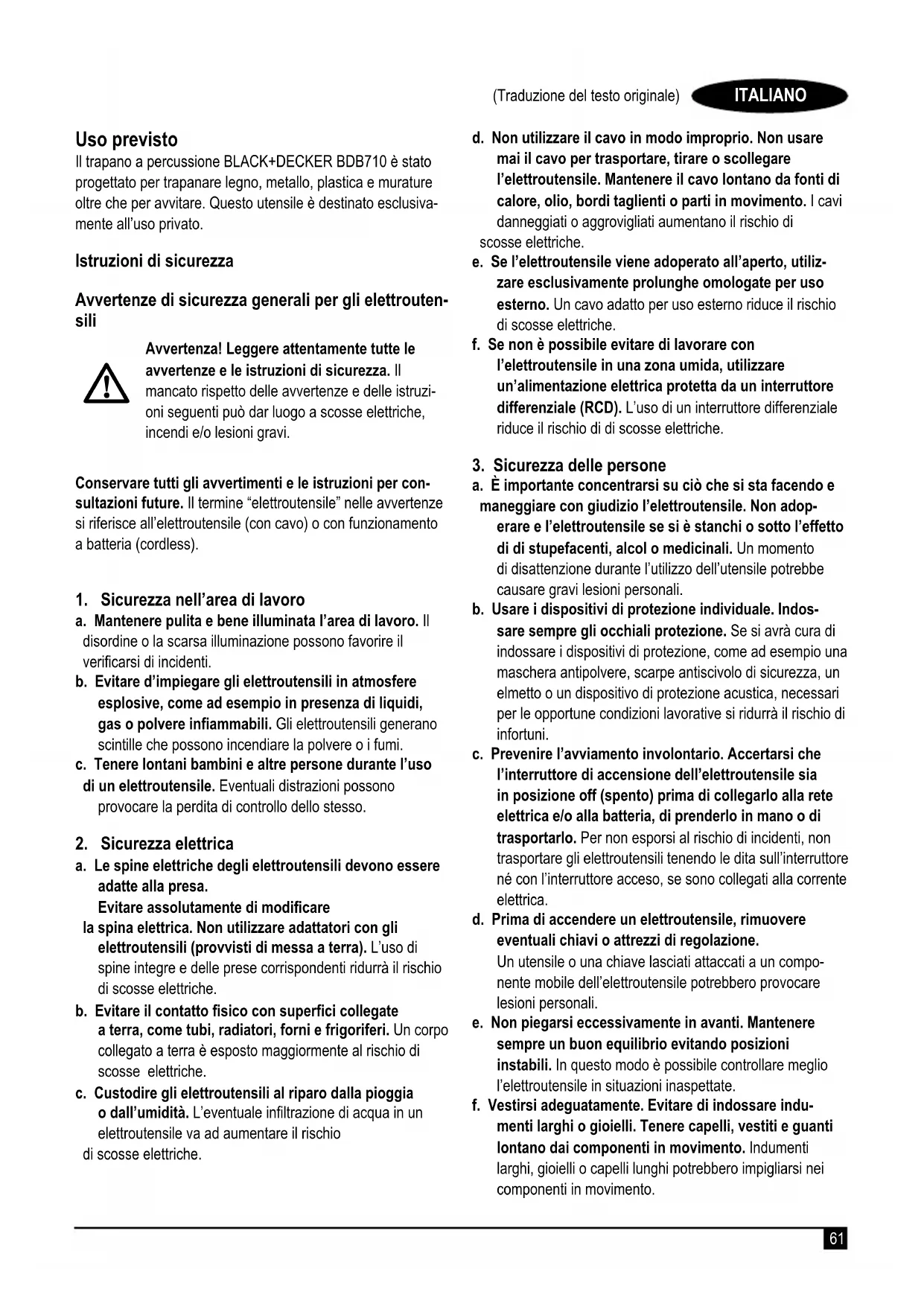 Mikulinci 4a, 10010 ZAGREB T: 00 385 (0)1 66 22 820 T: 00 385 (0)98 718 108 F: 00 385 (0) 1 66 22 823 info@profi -al.hr http://profi -al.hr/zagreb-hrvatska/ TITAN d.o.o. Bogoslava Šuleka 19, 47000 KARLOVAC T: 00 385 (0) 47 63 63 11 F: 00 385 (0) 47 63 63 10 info@titan.com.hr http://www.titan.com.hr/ VERMA d.o.o. Pere Devčića 23, 10290 ZAPREŠIĆ T: +385 1 3357 496 servis@verma.hr / verma@verma.hr www.verma.hr Uso previsto Il trapano a percussione BLACK+DECKER BDB710 è stato progettato per trapanare legno, metallo, plastica e murature oltre che per avvitare. Questo utensile è destinato esclusiva- mente all’uso privato. Istruzioni di sicurezza Avvertenze di sicurezza generali per gli elettrouten- sili