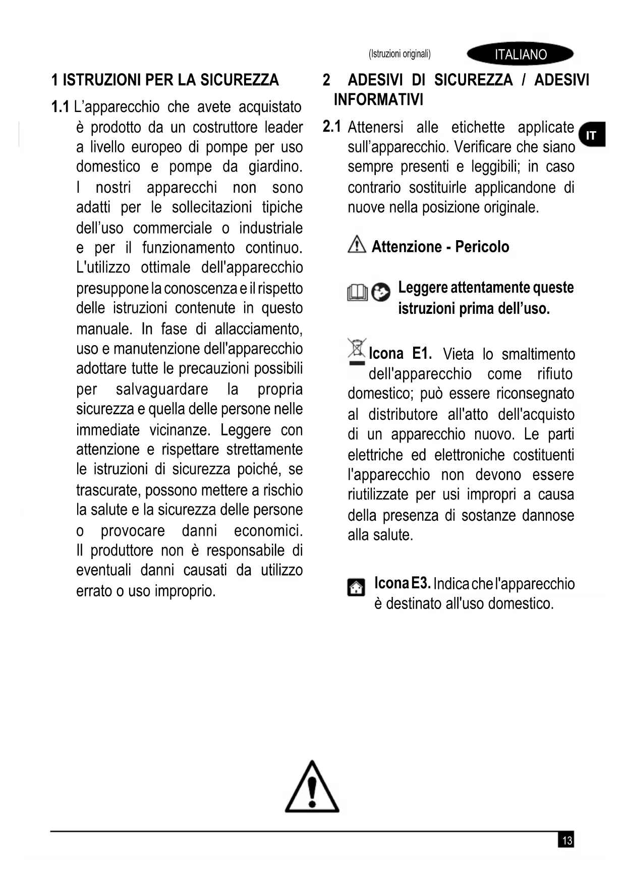 Attenersi alle etichette applicate sull’apparecchio. Verificare che siano sempre presenti e leggibili; in caso contrario sostituirle applicandone di nuove nella posizione originale. Attenzione - Pericolo Leggere attentamente queste istruzioni prima dell’uso. Icona E1. Vieta lo smaltimento dell'apparecchio come rifiuto domestico; può essere riconsegnato al distributore all'atto dell'acquisto di un apparecchio nuovo. Le parti elettriche ed elettroniche costituenti l'apparecchio non devono essere riutilizzate per usi impropri a causa della presenza di sostanze dannose alla salute. Icona E3. Indica che l'apparecchio è destinato all'uso domestico.14 ITALIANO (Istruzioni originali)