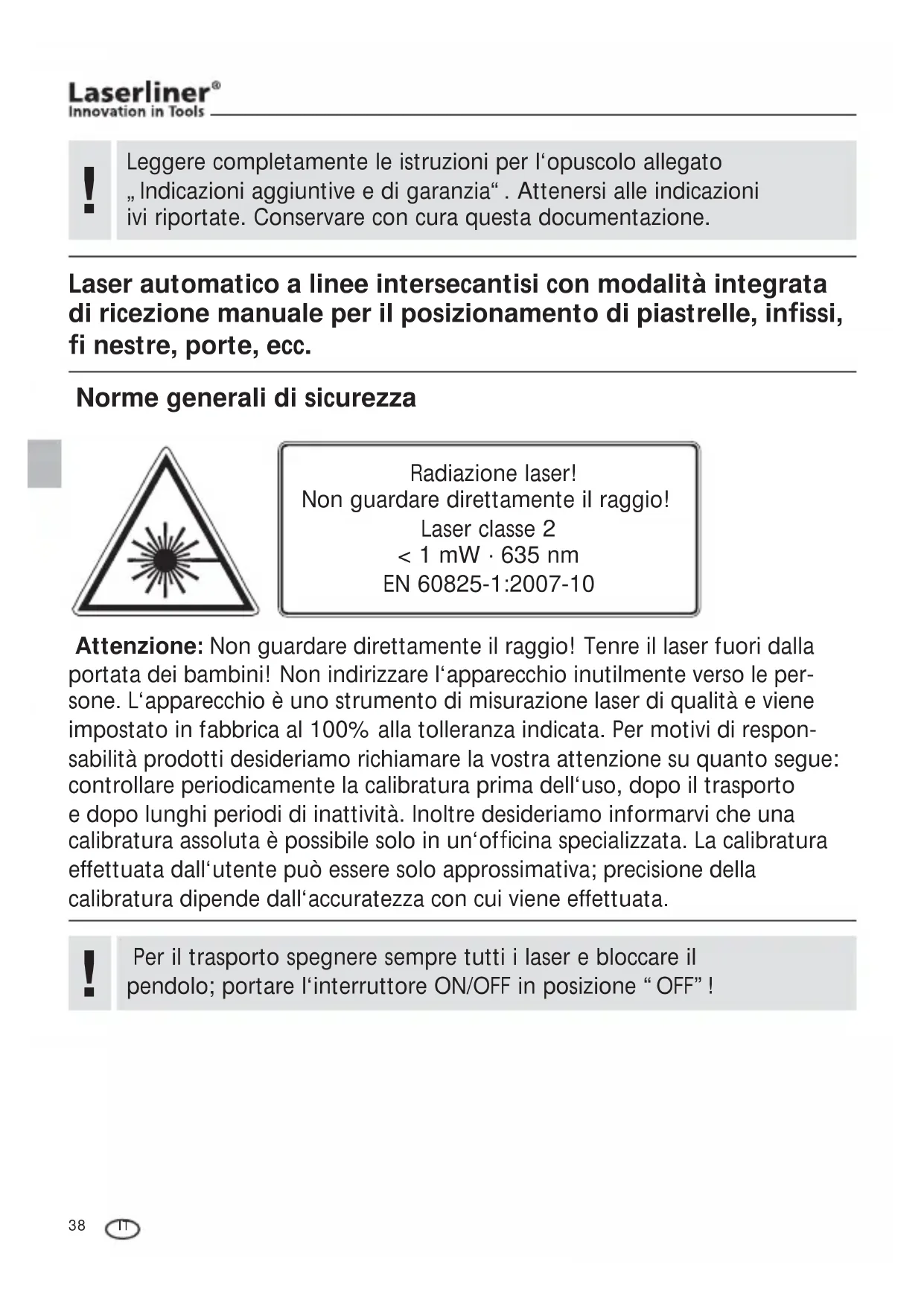 Laser automatico a linee intersecantisi con modalità integrata di ricezione manuale per il posizionamento di piastrelle, inƂ ssi, Ƃ nestre, porte, ecc. Norme generali di sicurezza Attenzione: Non guardare direttamente il raggio! Tenre il laser fuori dalla portata dei bambini! Non indirizzare l‘apparecchio inutilmente verso le per- sone. L‘apparecchio è uno strumento di misurazione laser di qualità e viene impostato in fabbrica al 100% alla tolleranza indicata. Per motivi di respon- sabilità prodotti desideriamo richiamare la vostra attenzione su quanto segue: controllare periodicamente la calibratura prima dell‘uso, dopo il trasporto e dopo lunghi periodi di inattività. Inoltre desideriamo informarvi che una calibratura assoluta è possibile solo in un‘ofÖ cina specializzata. La calibratura effettuata dall‘utente può essere solo approssimativa; precisione della calibratura dipende dall‘accuratezza con cui viene effettuata. Radiazione laser! Non guardare direttamente il raggio! Laser classe 2 < 1 mW · 635 nm EN 60825-1:2007-10 Per il trasporto spegnere sempre tutti i laser e bloccare il pendolo; portare l‘interruttore ON/OFF in posizione “OFF”!