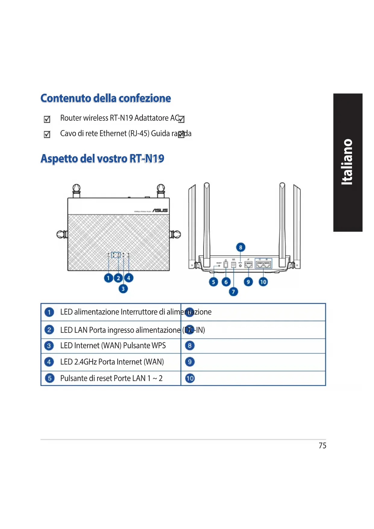 - Afelhasználóiútmutatóonlineverziójaahttps://www.asus.com/support címen érhető el75 Italiano Aspetto del vostro RT-N19 LED alimentazione Interruttore di alimentazione LED LAN Porta ingresso alimentazione (DC-IN) LED Internet (WAN) Pulsante WPS LED 2.4GHz Porta Internet (WAN) Pulsante di reset Porte LAN 1 ~ 2 Contenuto della confezione Router wireless RT-N19 Adattatore AC Cavo di rete Ethernet (RJ-45) Guida rapida Italiano76 Italiano Posizionamento del vostro router wireless Per ottenere una migliore trasmissione del segnale tra il router wireless e i dispositivi di rete connessi assicuratevi di: