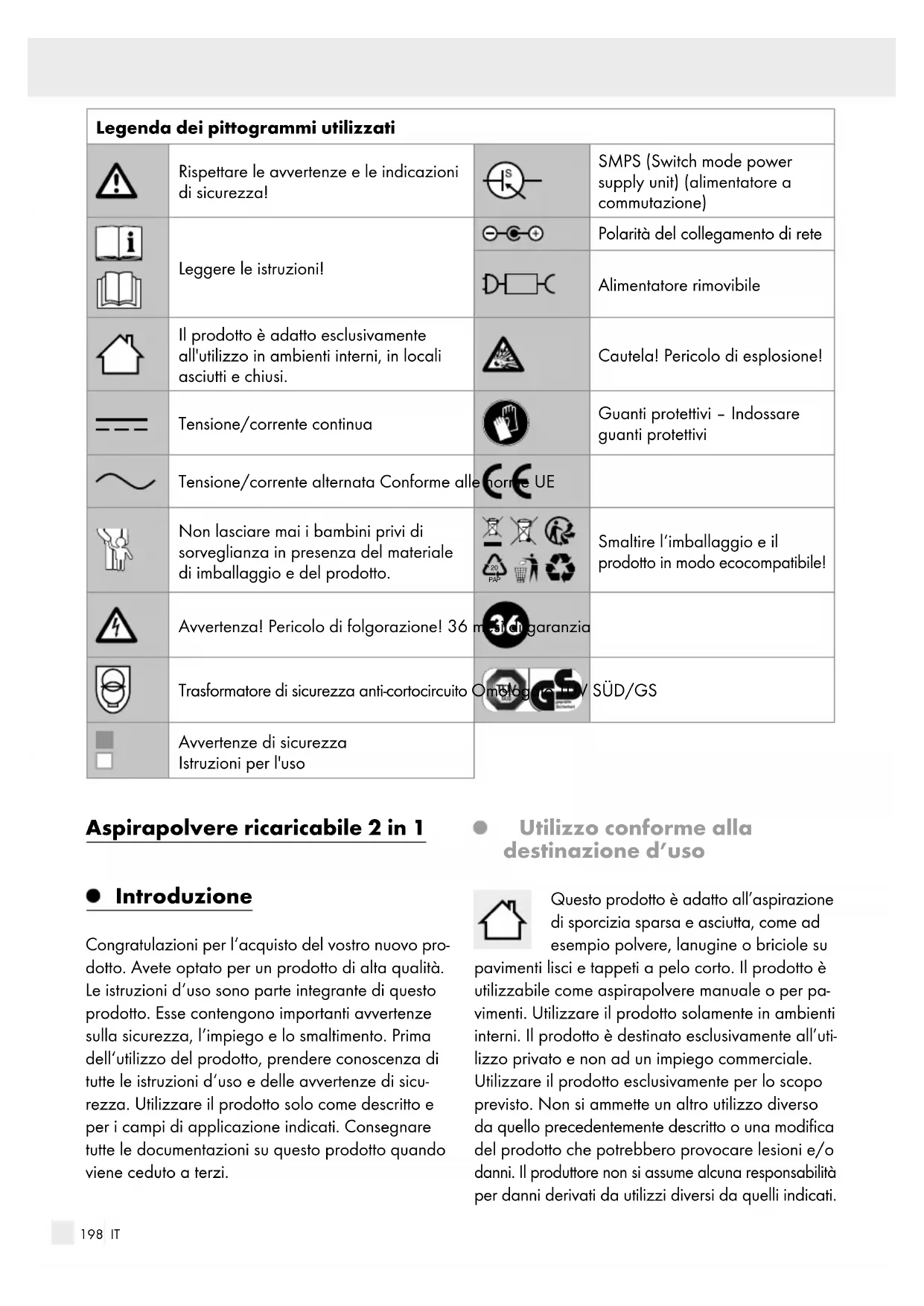 PAP Smaltire l‘imballaggio e il prodotto in modo ecocompatibile! Avvertenza! Pericolo di folgorazione! 36 mesi di garanzia Trasformatore di sicurezza anti-cortocircuito Omologato TÜV SÜD/GS Avvertenze di sicurezza Istruzioni per l'uso Aspirapolvere ricaricabile 2 in 1 Introduzione Congratulazioni per l‘acquisto del vostro nuovo pro- dotto. Avete optato per un prodotto di alta qualità. Le istruzioni d‘uso sono parte integrante di questo prodotto. Esse contengono importanti avvertenze sulla sicurezza, l‘impiego e lo smaltimento. Prima dell‘utilizzo del prodotto, prendere conoscenza di tutte le istruzioni d‘uso e delle avvertenze di sicu- rezza. Utilizzare il prodotto solo come descritto e per i campi di applicazione indicati. Consegnare tutte le documentazioni su questo prodotto quando viene ceduto a terzi. Utilizzo conforme alla destinazione d’uso Questo prodotto è adatto all’aspirazione di sporcizia sparsa e asciutta, come ad esempio polvere, lanugine o briciole su pavimenti lisci e tappeti a pelo corto. Il prodotto è utilizzabile come aspirapolvere manuale o per pa- vimenti. Utilizzare il prodotto solamente in ambienti interni. Il prodotto è destinato esclusivamente all’uti- lizzo privato e non ad un impiego commerciale. Utilizzare il prodotto esclusivamente per lo scopo previsto. Non si ammette un altro utilizzo diverso da quello precedentemente descritto o una modifica del prodotto che potrebbero provocare lesioni e/o danni. Il produttore non si assume alcuna responsabilità per danni derivati da utilizzi diversi da quelli indicati.199 IT Descrizione dei componenti
