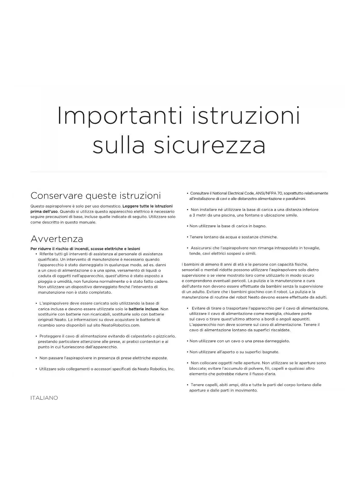 - ATTENZIONE: Ai fini della ricarica della batteria, utilizzare esclusivamente l’unità di alimentazione staccabile (Modello: S030BBM1950150) fornita con questo apparecchio. ATTENZIONE! RISCHIO DANNEGGIAMENTO! I robot aspirapolvere Neato sono autonomi e si muovono da soli/senza intervento umano. Per proteggere il robot da danneggiamenti, cadute o altri pericoli, e per prevenire danni a persone o cose, si prega di controllare attentamente l’area destinata alla pulizia prima di attivarlo. Ponete barriere fisiche di fronte a tutte le aree e/o oggetti delicati o pericolosi. Si prega di posizionare delle barriere fisiche per proteggere il robot dal navigare verso, avvicinarsi a e/o entrare contatto con - superfici inclinate - scale - ascensori - porte esterne aperte - balconi - camini - piscine interne. Unità di alimentazione staccabileITALIANO Informazioni normative Neato Robotics, Inc. 50 Rio Robles San Jose, CA 95134 USA Neato Robotics Co., Ltd. #942 Win Aoyama, 2-2-15 Minami-Aoyama, Minato-ku. Tokyo 107-0062 Japan Neato B.V. WTC Schiphol Airport, Toren D Schiphol Boulevard 359 1118 BJ Schiphol Netherlands Neato Robotics Inc. dichiara che gli Aspiratori Robot, D8, D9, D10 sono conformi alla direttiva sulle apparecchiature radio (RED) 2014/53/UE. Dichiarazione di conformità CE Il testo integrale della dichiarazione di conformità UE è disponibile online al seguente indirizzo: www.neatorobotics.com/EC. REACH I prodotti Neato Robotics sono “articoli” in base a quanto definito nell’Articolo 3(3) di REACH e non rilasciano sostanze in normali condizioni di utilizzo. Il fascicolo tecnico della costruzione si trova presso l’ucio nel Regno Unitodi Neato Robotics. Il rappresentante autorizzato con sede nella comunità è: Neato Robotics, ucio nel Regno Unito. Le ultime due cifre dell’anno in cui è stato apposto ilmarchio CE sui modelli Botvac sono 14. Dichiarazione di conformità FCC e Industry Canada Questo dispositivo è conforme alla Parte 15 delle normative FCC. Il funzionamento è soggetto alle due condizioni seguenti: (1) Il presente dispositivo non deve causare pericolose interferenze, e (2) Il presente dispositivo deve accettare eventuali interferenze ricevute, incluse quelle che potrebbero causare un funzionamento indesiderato. Attenzione: Cambiamenti o modifiche non espressamente approvati da “Neato Robotics” possono invalidare il diritto dell’utente a utilizzare l’apparecchiatura. Attenzione! Pericolo di radiazioni RF Per assicurare la conformità ai requisiti sull’esposizione alle radiazioni RF di FCC e Industry Canada, il presente dispositivo deve essere installato in un luogo in cui le antenne del dispositivo abbiano una distanza minima di almeno 20 cm dalle persone. L’utilizzo di antenne a guadagno più elevato e tipi di antenne non certificati per l’uso con questo prodotto non è consentito. Il dispositivo non deve essere posizionato in un luogo in cui è presente un altro trasmettitore. Dichiarazione di esposizione alle radiazioni IC/ISED Questo prodotto è conforme ai limiti di esposizione alle radiofrequenze trasportabili secondo lo standard canadese RSS-102, stabilito per un ambiente non controllato, ed è sicuro per il funzionamento previsto, come descritto in questo manuale. Avviso e marcatura Industry Canada Il termine “IC:” davanti al numero di certificazione radio significa solo che sono state soddisfatte le specifiche tecniche Industry Canada.ITALIANO Il presente dispositivo è conforme ai RSS esenti da licenza di Industry Canada. Il funzionamento è soggetto alle due condizioni seguenti: (1) Il dispositivo non deve causare interferenze dannose, ed (2) è necessario che il dispositivo accetti qualsiasi interferenza ricevuta, incluse quelle che possono causare un funzionamento indesiderato. Laser Il sensore di navigazione contiene un laser rotante di classe 1 in base alla norma IEC/EN 60825-1 durante tutte le procedure di funzionamento.