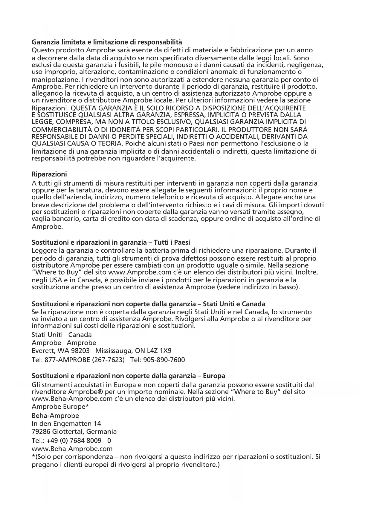 Multimetro digitale Manuale d’uso 6/2015, 6005740 A ©2015 Amprobe Test Tools. Tutti i diritti riservati. Stampato in Cina. ItalianoGaranzia limitata e limitazione di responsabilità Questo prodotto Amprobe sarà esente da difetti di materiale e fabbricazione per un anno a decorrere dalla data di acquisto se non specificato diversamente dalle leggi locali. Sono esclusi da questa garanzia i fusibili, le pile monouso e i danni causati da incidenti, negligenza, uso improprio, alterazione, contaminazione o condizioni anomale di funzionamento o manipolazione. I rivenditori non sono autorizzati a estendere nessuna garanzia per conto di Amprobe. Per richiedere un intervento durante il periodo di garanzia, restituire il prodotto, allegando la ricevuta di acquisto, a un centro di assistenza autorizzato Amprobe oppure a un rivenditore o distributore Amprobe locale. Per ulteriori informazioni vedere la sezione Riparazioni. QUESTA GARANZIA È IL SOLO RICORSO A DISPOSIZIONE DELL’ACQUIRENTE E SOSTITUISCE QUALSIASI ALTRA GARANZIA, ESPRESSA, IMPLICITA O PREVISTA DALLA LEGGE, COMPRESA, MA NON A TITOLO ESCLUSIVO, QUALSIASI GARANZIA IMPLICITA DI COMMERCIABILITÀ O DI IDONEITÀ PER SCOPI PARTICOLARI. IL PRODUTTORE NON SARÀ RESPONSABILE DI DANNI O PERDITE SPECIALI, INDIRETTI O ACCIDENTALI, DERIVANTI DA QUALSIASI CAUSA O TEORIA. Poiché alcuni stati o Paesi non permettono l’esclusione o la limitazione di una garanzia implicita o di danni accidentali o indiretti, questa limitazione di responsabilità potrebbe non riguardare l’acquirente. Riparazioni A tutti gli strumenti di misura restituiti per interventi in garanzia non coperti dalla garanzia oppure per la taratura, devono essere allegate le seguenti informazioni: il proprio nome e quello dell’azienda, indirizzo, numero telefonico e ricevuta di acquisto. Allegare anche una breve descrizione del problema o dell’intervento richiesto e i cavi di misura. Gli importi dovuti per sostituzioni o riparazioni non coperte dalla garanzia vanno versati tramite assegno, vaglia bancario, carta di credito con data di scadenza, oppure ordine di acquisto all’ordine di Amprobe. Sostituzioni e riparazioni in garanzia – Tutti i Paesi Leggere la garanzia e controllare la batteria prima di richiedere una riparazione. Durante il periodo di garanzia, tutti gli strumenti di prova difettosi possono essere restituiti al proprio distributore Amprobe per essere cambiati con un prodotto uguale o simile. Nella sezione “Where to Buy” del sito www.Amprobe.com c’è un elenco dei distributori più vicini. Inoltre, negli USA e in Canada, è possibile inviare i prodotti per le riparazioni in garanzia e la sostituzione anche presso un centro di assistenza Amprobe (vedere indirizzo in basso). Sostituzioni e riparazioni non coperte dalla garanzia – Stati Uniti e Canada Se la riparazione non è coperta dalla garanzia negli Stati Uniti e nel Canada, lo strumento va inviato a un centro di assistenza Amprobe. Rivolgersi alla Amprobe o al rivenditore per informazioni sui costi delle riparazioni e sostituzioni. Stati Uniti Canada Amprobe Amprobe Everett, WA 98203 Mississauga, ON L4Z 1X9 Tel: 877-AMPROBE (267-7623) Tel: 905-890-7600 Sostituzioni e riparazioni non coperte dalla garanzia – Europa Gli strumenti acquistati in Europa e non coperti dalla garanzia possono essere sostituiti dal rivenditore Amprobe® per un importo nominale. Nella sezione “Where to Buy” del sito www.Beha-Amprobe.com c’è un elenco dei distributori più vicini. Amprobe Europe* Beha-Amprobe In den Engematten 14 79286 Glottertal, Germania Tel.: +49 (0) 7684 8009 - 0 www.Beha-Amprobe.com *(Solo per corrispondenza – non rivolgersi a questo indirizzo per riparazioni o sostituzioni. Si pregano i clienti europei di rivolgersi al proprio rivenditore.)AM-535-EUR Multimetro digitale