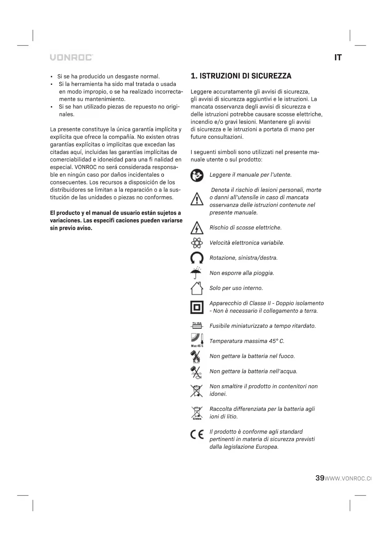 I prodotti VONROC sono sviluppati secondo i più elevati standard di qualità e viene garantita l’assen- za di difetti nei materiali e nella manodopera per il periodo contrattuale a partire dalla data di acquisto originale. Qualora il prodotto dovesse subire un guasto qualsiasi durante questo periodo a causa di difetti nei materiali e/o nella manodopera, si prega di contattare direttamente il VONROC. Le seguenti circostanze sono escluse da questa garanzia: