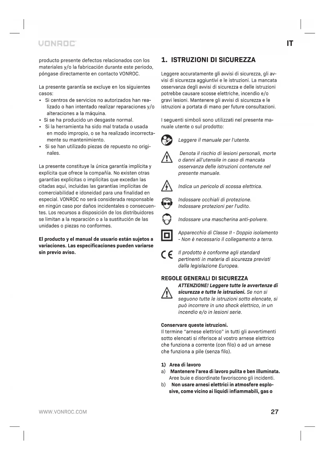 Sono state utilizzate parti di ricambio non originali Ciò costituisce l’unica garanzia espressa o implicita fornita dall’azienda. Non esistono altre garanzie espresse o implicite che si estendono oltre il presente documento, ivi comprese le garanzie im- plicite di commerciabilità e idoneità per uno scopo particolare. In nessun caso VONROC sarà responsa- bile di eventuali danni incidentali o consequenziali. I rimedi dei rivenditori saranno limitati alla ripara- zione o sostituzione di unità o parti non conformi. Il prodotto e il manuale per l’utente sono soggetti a modifiche. I dati tecnici possono essere modificati senza ulteriore notifica.
