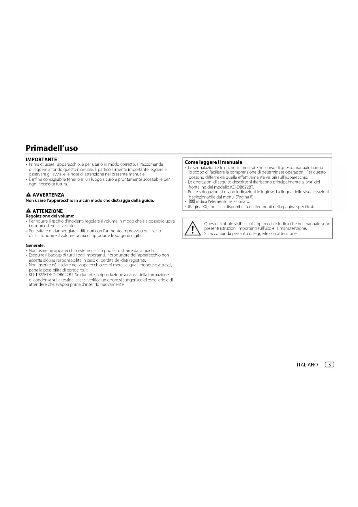- KD-T922BT/KD-DB622BT: Se durante la riproduzione a causa della formazione di condensa sulla testina laser si verifica un errore si suggerisce di espellerlo e di attendere che evapori prima d’inserirlo nuovamente. Come leggere il manuale