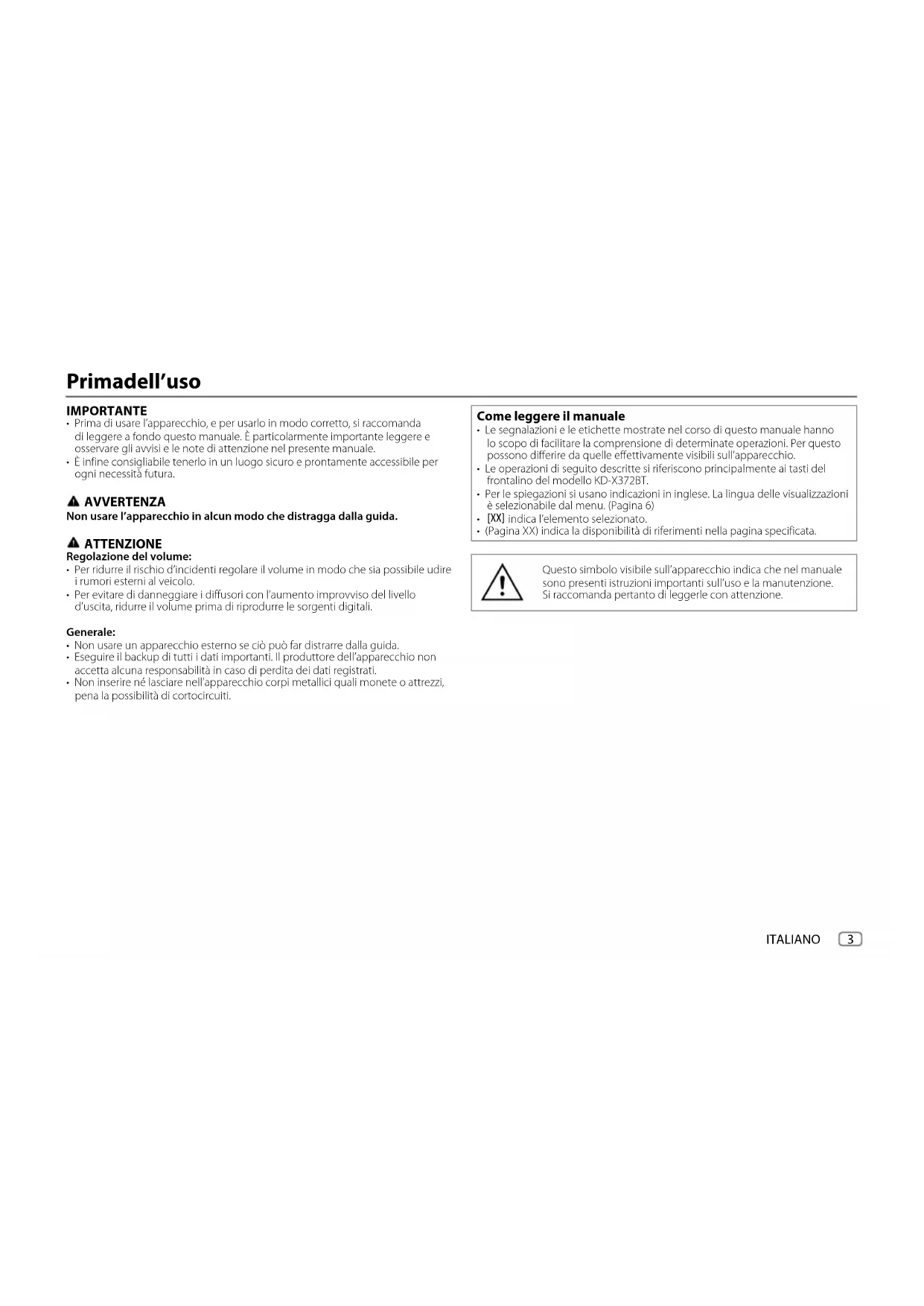 - Prima di usare l’apparecchio, e per usarlo in modo corretto, si raccomanda di leggere a fondo questo manuale. È particolarmente importante leggere e osservare gli avvisi e le note di attenzione nel presente manuale.