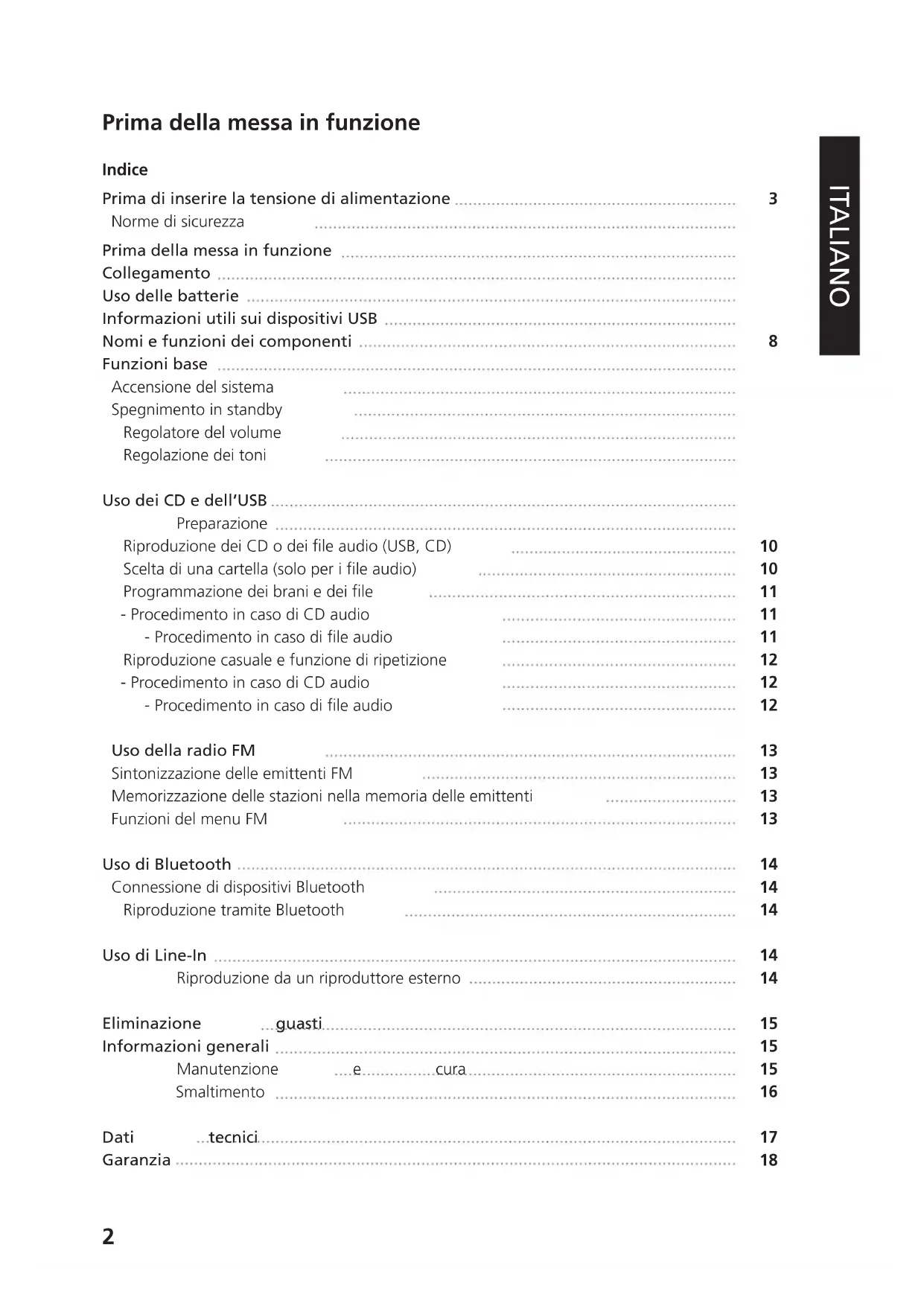 Prima della messa in funzione Indice Prima di inserire la tensione di alimentazione Norme di sicurezza Prima della messa in funzione Collegamento Uso delle batterie Informazioni utili sui dispositivi USB Nomi e funzioni dei componenti Funzioni base Accensione del sistema Spegnimento in standby Regolatoredelvolume Regolazionedeitoni Uso dei CD e dell‘USB Preparazione RiproduzionedeiCDodeileaudio(USB,CD) Sceltadiunacartella(soloperileaudio) Programmazionedeibraniedeile - Procedimento in caso di CD audio -Procedimentoincasodileaudio Riproduzionecasualeefunzionediripetizione - Procedimento in caso di CD audio -Procedimentoincasodileaudio Uso della radio FM Sintonizzazione delle emittenti FM Memorizzazione delle stazioni nella memoria delle emittenti Funzioni del menu FM Uso di Bluetooth Connessione di dispositivi Bluetooth RiproduzionetramiteBluetooth Uso di Line-In Riproduzionedaunriproduttoreesterno Eliminazione guasti Informazioni generali Manutenzione e cura Smaltimento Dati tecnici Garanzia