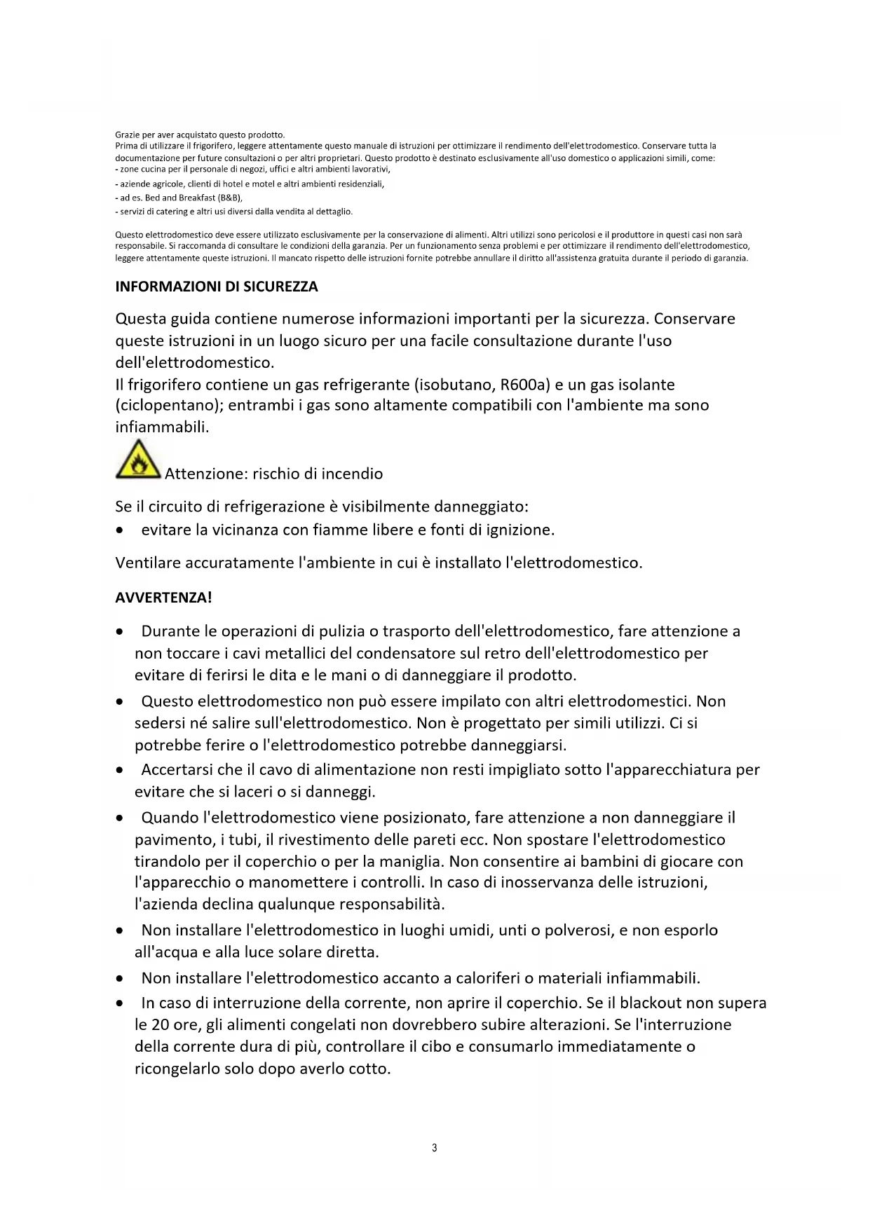 Sull'unità è riportato il simbolo di conformità alla Direttiva europea 2012/19/UE relativa allo smaltimento di apparecchiature elettriche ed elettroniche usate (WEEE). Le apparecchiature elettriche ed elettroniche di scarto contengono sostanze inquinanti (pericolose per l'ambiente) e componenti riutilizzabili. Le apparecchiature elettriche ed elettroniche di scarto devono essere sottoposte a trattamenti specifici per rimuovere e smaltire adeguatamente tutte le sostanze inquinanti e per recuperare e riciclare i materiali. Osservando alcune regole basilari, tutti possono contribuire a evitare danni ambientali causati dalle apparecchiature elettriche ed elettroniche di scarto: Le apparecchiature elettriche ed elettroniche di scarto non devono essere gestite come rifiuti domestici. Le apparecchiature elettriche ed elettroniche di scarto devono essere consegnate negli appositi punti di raccolta gestiti dagli enti comunali o da aziende regolarmente registrate. In molti paesi è prevista la raccolta a domicilio delle apparecchiature elettriche ed elettroniche di scarto di dimensioni notevoli. In molto paesi, quando si acquista un nuovo elettrodomestico, quello vecchio può essere restituito al rivenditore che è obbligato a prelevarlo gratuitamente alla consegna di quello nuovo, purché sia di tipo equivalente e abbia le stesse funzioni di quello fornito. Conformità L'applicazione del contrassegno sul prodotto garantisce la conformità a tutti i requisiti in materia di sicurezza, salute e ambiente previsti dalla legge. 20Inglese Thank you for purchasing this product. Before using your refrigerator, please carefully read this instruction manual in order to maximize its performance. Store all documentation for subsequent use or for other owners. This product is intended solely for household use or similar applications such as: - the kitchen area for personnel in shops, offices and other working environments - on farms, by clientele of hotels, motels and other environments of a residential type - at bed and breakfasts (B & B) - for catering services and similar applications not for retail sale. This appliance must be used only for purposes of storage of food, any other use is considered dangerous and the manufacturer will not be responsible for any omissions. Also, it is recommended that you take note of the warranty conditions. Please, to obtain the best possible performance and trouble free operation from your appliance it is very important to carefully read these instructions. Failure to observe these instructions may invalidate your right to free service during the guarantee period. SAFETY INFORMATION This guide contains many important safety information. Please, we suggest you keep these instructions in a safe place for easy reference and a good experience with the appliance. The refrigerator contains a refrigerant gas (R600a: isobutane) and insulating gas (cyclopentane), with high compatibility with the environment, that are, however, inflammable. Caution: risk of fire If the refrigerant circuit should be damaged: