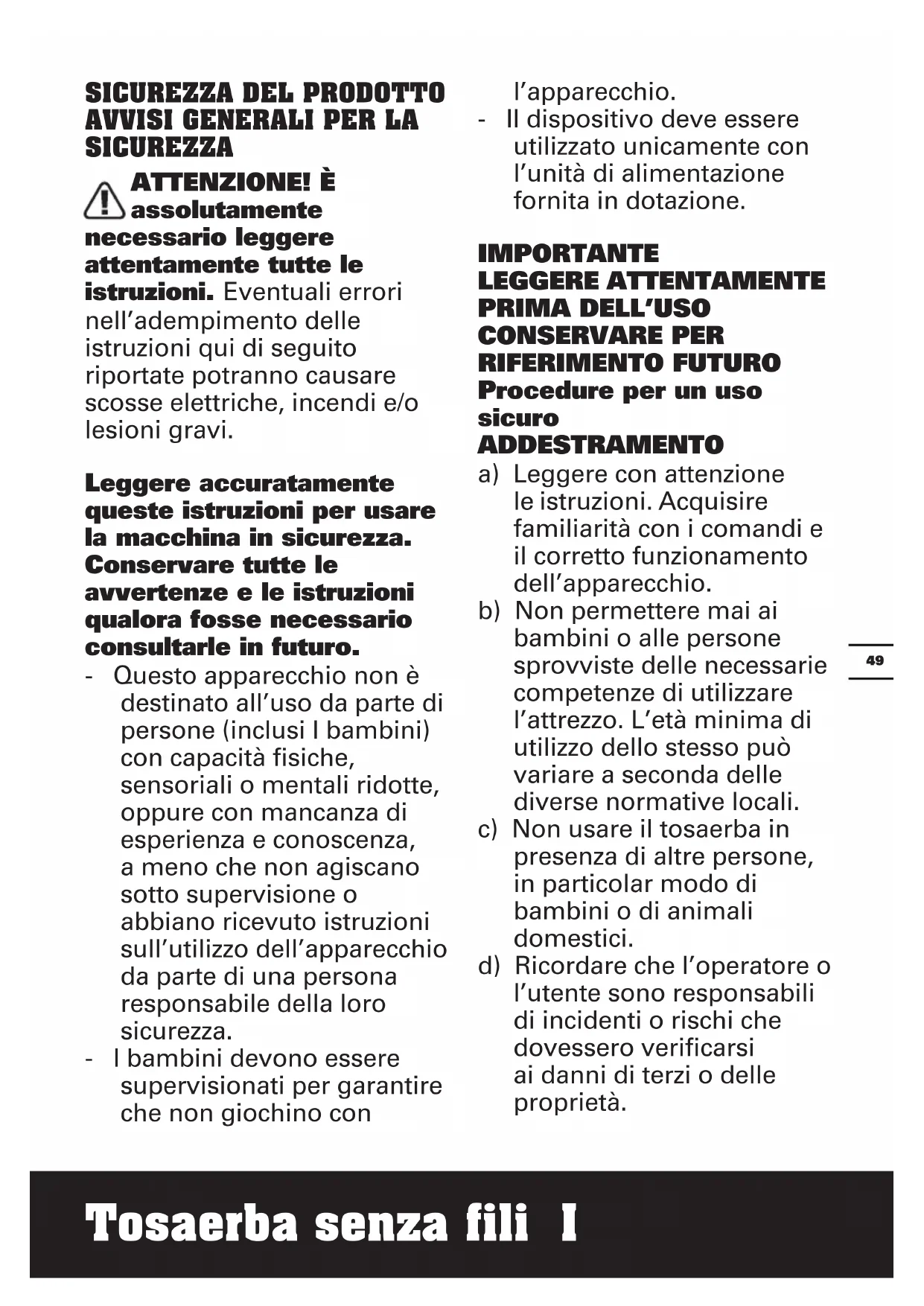 CONSERVARE PER RIFERIMENTO FUTURO Procedure per un uso sicuro ADDESTRAMENTO a) Leggere con attenzione le istruzioni. Acquisire familiarità con i comandi e il corretto funzionamento dell’apparecchio. b) Non permettere mai ai bambini o alle persone sprovviste delle necessarie competenze di utilizzare l’attrezzo. L’età minima di utilizzo dello stesso può variare a seconda delle diverse normative locali. c) Non usare il tosaerba in presenza di altre persone, in particolar modo di bambini o di animali domestici. d) Ricordare che l’operatore o l’utente sono responsabili di incidenti o rischi che dovessero verificarsi ai danni di terzi o delle proprietà.5150 Tosaerba senza fili I OPERAZIONI PRELIMINARI a) Durante il lavoro, indossare sempre calzature robuste e pantaloni lunghi. Non utilizzare l’apparecchio scalzi o indossando sandali aperti. b) Ispezionare con attenzione l’area in cui si deve utilizzare l’apparecchiatura e togliere tutti gli oggetti che potrebbero essere lanciati dall’apparecchiatura; c) Prima dell’uso, verificare visivamente che le lame, i rispettivi bulloni e il gruppo di taglio non siano usurati o danneggiati. In tal caso, sostituire le lame o i bulloni in blocco per mantenere l’equilibrio; Sostituire le etichette danneggiate e illeggibili. FUNZIONAMENTO a) Usare il tosaerba solo nelle ore diurne o in buone condizioni di luce artificiale. b) Se possibile, evitare di utilizzare l’apparecchio su erba bagnata. c) Sui terreni in pendenza, è necessario mantenere sempre la stabilità. d) Camminare, non correre mai; e) Per le apparecchiatura rotative dotate di ruote, effettuare il taglio in senso trasversale a superfici inclinati, mai dall’alto verso il basso; f) Prestare estrema attenzione ai cambi di direzione nelle suddette condizioni di pendenza. g) Non usare il tosaerba su pendii estremamente scoscesi. h) Prestare la massima attenzione tirando a sé l’apparecchio o invertendo la direzione dello stesso.