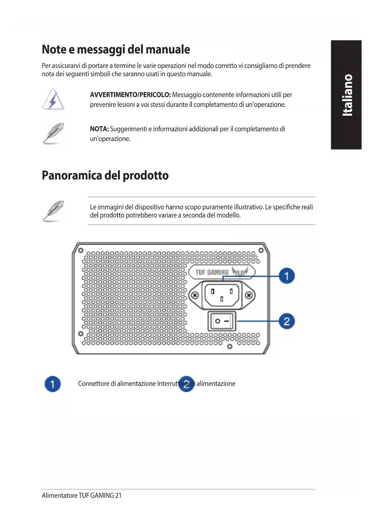 - Die Nichteinhaltung von Herstelleranweisungen und Sicherheitshinweisen führt sofort zum Erlöschen der Garantie. R45625 RoHSAlimentatore TUF GAMING 21 Italiano Italiano Note e messaggi del manuale Per assicurarvi di portare a termine le varie operazioni nel modo corretto vi consigliamo di prendere nota dei seguenti simboli che saranno usati in questo manuale. AVVERTIMENTO/PERICOLO: Messaggio contenente informazioni utili per prevenire lesioni a voi stessi durante il completamento di un'operazione. NOTA: Suggerimenti e informazioni addizionali per il completamento di un'operazione. Panoramica del prodotto Connettore di alimentazione Interruttore di alimentazione Le immagini del dispositivo hanno scopo puramente illustrativo. Le speciche reali del prodotto potrebbero variare a seconda del modello.Alimentatore TUF GAMING22 Italiano Prima di installare o rimuovere i cavi assicuratevi che il sistema sia spento, e che tutti i cavi di alimentazione di sistema e dispositivi periferici siano scollegati.