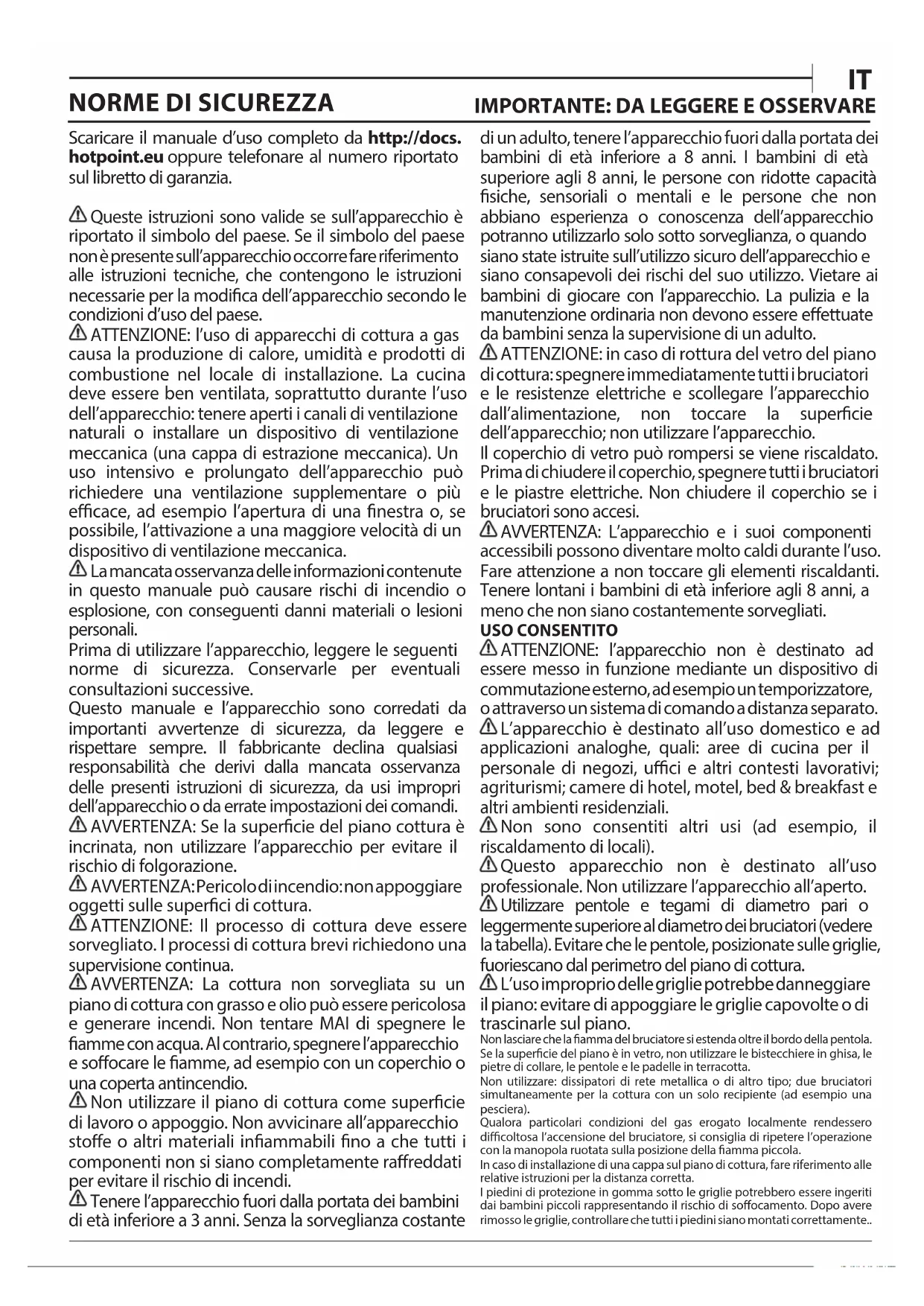 Scaricare il manuale d’uso completo da http://docs. hotpoint.eu oppure telefonare al numero riportato sul libretto di garanzia. Queste istruzioni sono valide se sull’apparecchio è riportato il simbolo del paese. Se il simbolo del paese non è presente sull’apparecchio occorre fare riferimento alle istruzioni tecniche, che contengono le istruzioni necessarie per la modica dell’apparecchio secondo le condizioni d’uso del paese. ATTENZIONE: l’uso di apparecchi di cottura a gas causa la produzione di calore, umidità e prodotti di combustione nel locale di installazione. La cucina deve essere ben ventilata, soprattutto durante l’uso dell’apparecchio: tenere aperti i canali di ventilazione naturali o installare un dispositivo di ventilazione meccanica (una cappa di estrazione meccanica). Un uso intensivo e prolungato dell’apparecchio può richiedere una ventilazione supplementare o più ecace, ad esempio l’apertura di una nestra o, se possibile, l’attivazione a una maggiore velocità di un dispositivo di ventilazione meccanica. La mancata osservanza delle informazioni contenute in questo manuale può causare rischi di incendio o esplosione, con conseguenti danni materiali o lesioni personali. Prima di utilizzare l’apparecchio, leggere le seguenti norme di sicurezza. Conservarle per eventuali consultazioni successive. Questo manuale e l’apparecchio sono corredati da importanti avvertenze di sicurezza, da leggere e rispettare sempre. Il fabbricante declina qualsiasi responsabilità che derivi dalla mancata osservanza delle presenti istruzioni di sicurezza, da usi impropri dell’apparecchio o da errate impostazioni dei comandi. AVVERTENZA: Se la supercie del piano cottura è incrinata, non utilizzare l’apparecchio per evitare il rischio di folgorazione. AVVERTENZA: Pericolo di incendio: non appoggiare oggetti sulle superci di cottura. ATTENZIONE: Il processo di cottura deve essere sorvegliato. I processi di cottura brevi richiedono una supervisione continua. AVVERTENZA: La cottura non sorvegliata su un piano di cottura con grasso e olio può essere pericolosa e generare incendi. Non tentare MAI di spegnere le amme con acqua. Al contrario, spegnere l’apparecchio e soocare le amme, ad esempio con un coperchio o una coperta antincendio. Non utilizzare il piano di cottura come supercie di lavoro o appoggio. Non avvicinare all’apparecchio stoe o altri materiali inammabili no a che tutti i componenti non si siano completamente rareddati per evitare il rischio di incendi. Tenere l’apparecchio fuori dalla portata dei bambini di età inferiore a 3 anni. Senza la sorveglianza costante di un adulto, tenere l’apparecchio fuori dalla portata dei bambini di età inferiore a 8 anni. I bambini di età superiore agli 8 anni, le persone con ridotte capacità siche, sensoriali o mentali e le persone che non abbiano esperienza o conoscenza dell’apparecchio potranno utilizzarlo solo sotto sorveglianza, o quando siano state istruite sull’utilizzo sicuro dell’apparecchio e siano consapevoli dei rischi del suo utilizzo. Vietare ai bambini di giocare con l’apparecchio. La pulizia e la manutenzione ordinaria non devono essere eettuate da bambini senza la supervisione di un adulto. ATTENZIONE: in caso di rottura del vetro del piano di cottura: spegnere immediatamente tutti i bruciatori e le resistenze elettriche e scollegare l’apparecchio dall’alimentazione, non toccare la supercie dell’apparecchio; non utilizzare l’apparecchio. Il coperchio di vetro può rompersi se viene riscaldato. Prima di chiudere il coperchio, spegnere tutti i bruciatori e le piastre elettriche. Non chiudere il coperchio se i bruciatori sono accesi. AVVERTENZA: L’apparecchio e i suoi componenti accessibili possono diventare molto caldi durante l’uso. Fare attenzione a non toccare gli elementi riscaldanti. Tenere lontani i bambini di età inferiore agli 8 anni, a meno che non siano costantemente sorvegliati. USO CONSENTITO ATTENZIONE: l’apparecchio non è destinato ad essere messo in funzione mediante un dispositivo di commutazione esterno, ad esempio un temporizzatore, o attraverso un sistema di comando a distanza separato. L’apparecchio è destinato all’uso domestico e ad applicazioni analoghe, quali: aree di cucina per il personale di negozi, uci e altri contesti lavorativi; agriturismi; camere di hotel, motel, bed & breakfast e altri ambienti residenziali. Non sono consentiti altri usi (ad esempio, il riscaldamento di locali). Questo apparecchio non è destinato all’uso professionale. Non utilizzare l’apparecchio all’aperto. Utilizzare pentole e tegami di diametro pari o leggermente superiore al diametro dei bruciatori (vedere la tabella). Evitare che le pentole, posizionate sulle griglie, fuoriescano dal perimetro del piano di cottura. L’uso improprio delle griglie potrebbe danneggiare il piano: evitare di appoggiare le griglie capovolte o di trascinarle sul piano. Non lasciare che la amma del bruciatore si estenda oltre il bordo della pentola.Se la supercie del piano è in vetro, non utilizzare le bistecchiere in ghisa, le pietre di collare, le pentole e le padelle in terracotta.Non utilizzare: dissipatori di rete metallica o di altro tipo; due bruciatori simultaneamente per la cottura con un solo recipiente (ad esempio una pesciera).Qualora particolari condizioni del gas erogato localmente rendessero dicoltosa l’accensione del bruciatore, si consiglia di ripetere l’operazione con la manopola ruotata sulla posizione della amma piccola.In caso di installazione di una cappa sul piano di cottura, fare riferimento alle relative istruzioni per la distanza corretta.I piedini di protezione in gomma sotto le griglie potrebbero essere ingeriti dai bambini piccoli rappresentando il rischio di soocamento. Dopo avere rimosso le griglie, controllare che tutti i piedini siano montati correttamente..INSTALLAZIONE Per evitare il rischio di lesioni personali, le operazioni di movimentaz