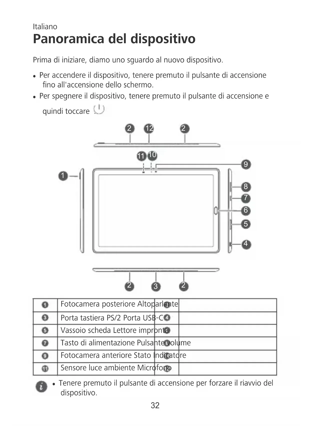 Fotocamera posteriore Altoparlante Porta tastiera PS/2 Porta USB-C Vassoio scheda Lettore impronta Tasto di alimentazione Pulsante volume Fotocamera anteriore Stato Indicatore Sensore luce ambiente Microfono l Tenere premuto il pulsante di accensione per forzare il riavvio del dispositivo. Italiano 32Operazioni preliminari Seguire le istruzioni contenute nelle seguenti gure per impostare il dispositivo. NJDSP4% Fare attenzione a non grafare il dispositivo o farsi male quando si utilizza lo strumento di rimozione. Conservare lo strumento di rimozione lontano dalla portata dei bambini per prevenire lesioni o ingestione accidentali. 33Per maggiori informazioni Se si riscontrano problemi durante l'utilizzo del dispositivo, è possibile ricevere assistenza da parte delle seguenti risorse: l Visitare http://consumer.huawei.com/en per accedere alle info del dispositivo, le domande frequenti e altri dettagli. l Visitare http://consumer.huawei.com/en/support per le informazioni di contatto del Paese o della regione più aggiornate.