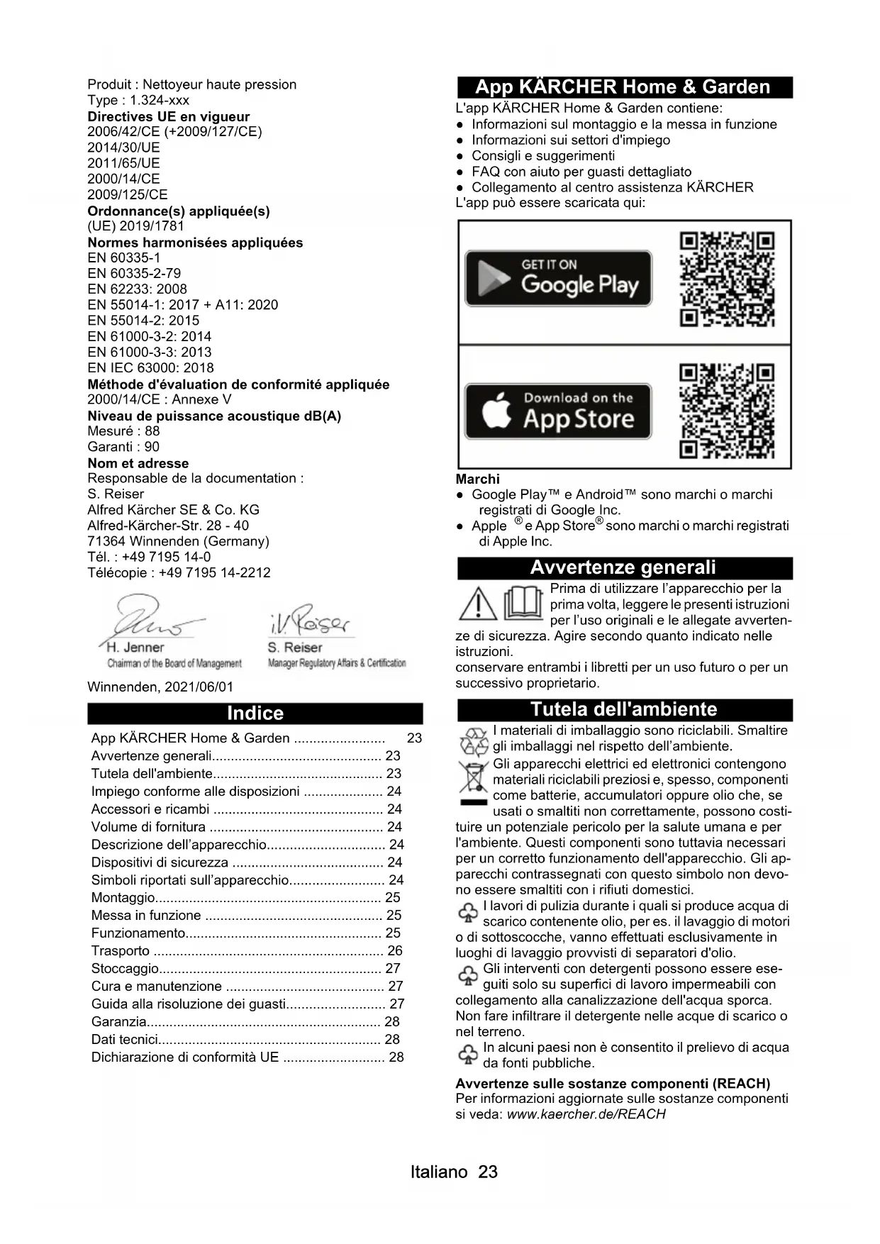 - sono marchi o marchi registrati di Apple Inc. Avvertenze generali Prima di utilizzare l’apparecchio per la prima volta, leggere le presenti istruzioni per l’uso originali e le allegate avverten- ze di sicurezza. Agire secondo quanto indicato nelle istruzioni. conservare entrambi i libretti per un uso futuro o per un successivo proprietario. Tutela dell'ambiente I materiali di imballaggio sono riciclabili. Smaltire gli imballaggi nel rispetto dell’ambiente. Gli apparecchi elettrici ed elettronici contengono materiali riciclabili preziosi e, spesso, componenti come batterie, accumulatori oppure olio che, se usati o smaltiti non correttamente, possono costi- tuire un potenziale pericolo per la salute umana e per l'ambiente. Questi componenti sono tuttavia necessari per un corretto funzionamento dell'apparecchio. Gli ap- parecchi contrassegnati con questo simbolo non devo- no essere smaltiti con i rifiuti domestici. I lavori di pulizia durante i quali si produce acqua di scarico contenente olio, per es. il lavaggio di motori o di sottoscocche, vanno effettuati esclusivamente in luoghi di lavaggio provvisti di separatori d'olio. Gli interventi con detergenti possono essere ese- guiti solo su superfici di lavoro impermeabili con collegamento alla canalizzazione dell'acqua sporca. Non fare infiltrare il detergente nelle acque di scarico o nel terreno. In alcuni paesi non è consentito il prelievo di acqua da fonti pubbliche. Avvertenze sulle sostanze componenti (REACH) Per informazioni aggiornate sulle sostanze componenti si veda: www.kaercher.de/REACH App KÄRCHER Home & Garden p. 23