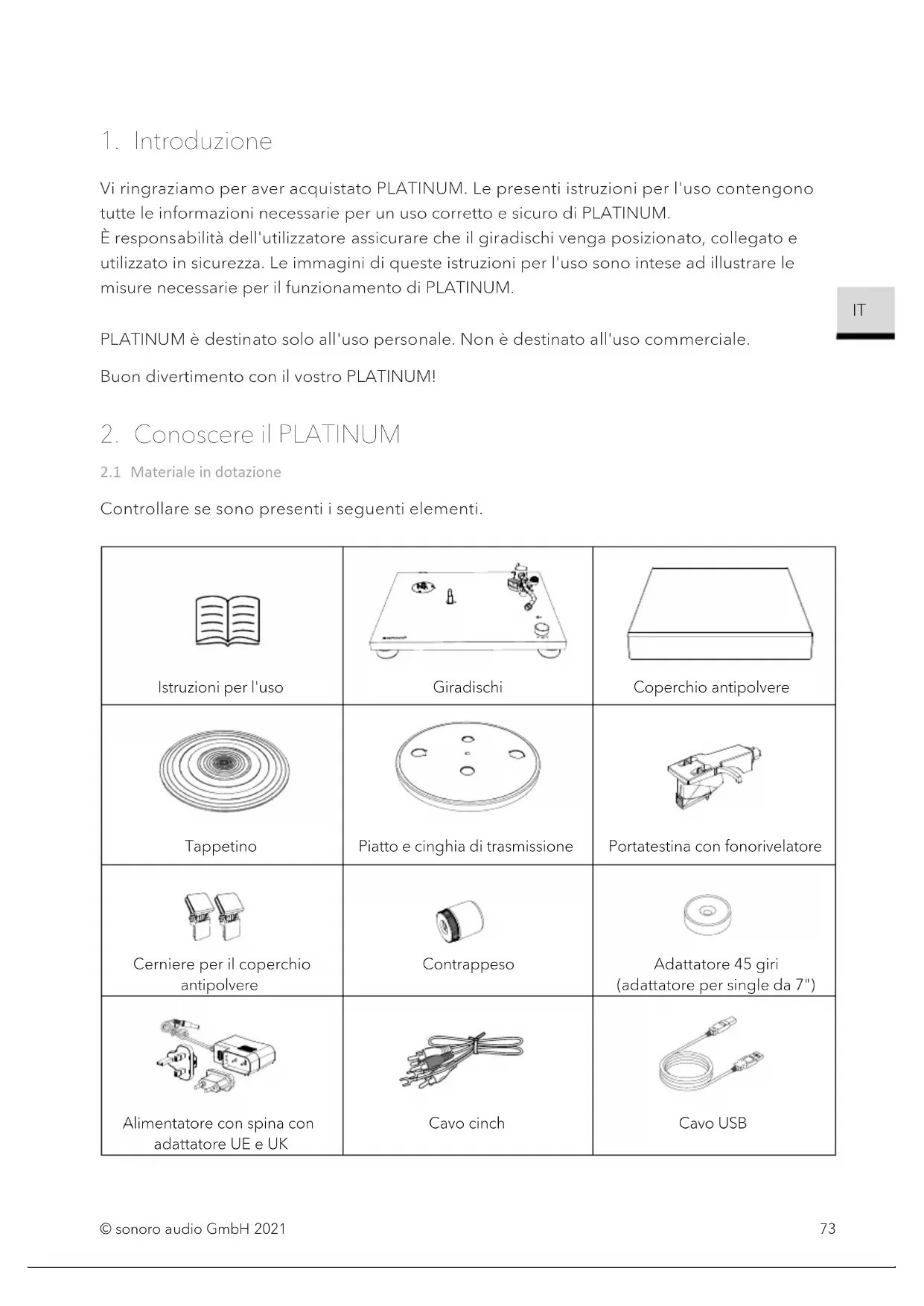 Vi ringraziamo per aver acquistato PLATINUM. Le presenti istruzioni per l'uso contengono tutte le informazioni necessarie per un uso corretto e sicuro di PLATINUM. È responsabilità dell'utilizzatore assicurare che il giradischi venga posizionato, collegato e utilizzato in sicurezza. Le immagini di queste istruzioni per l'uso sono intese ad illustrare le misure necessarie per il funzionamento di PLATINUM. PLATINUM è destinato solo all'uso personale. Non è destinato all'uso commerciale. Buon divertimento con il vostro PLATINUM!