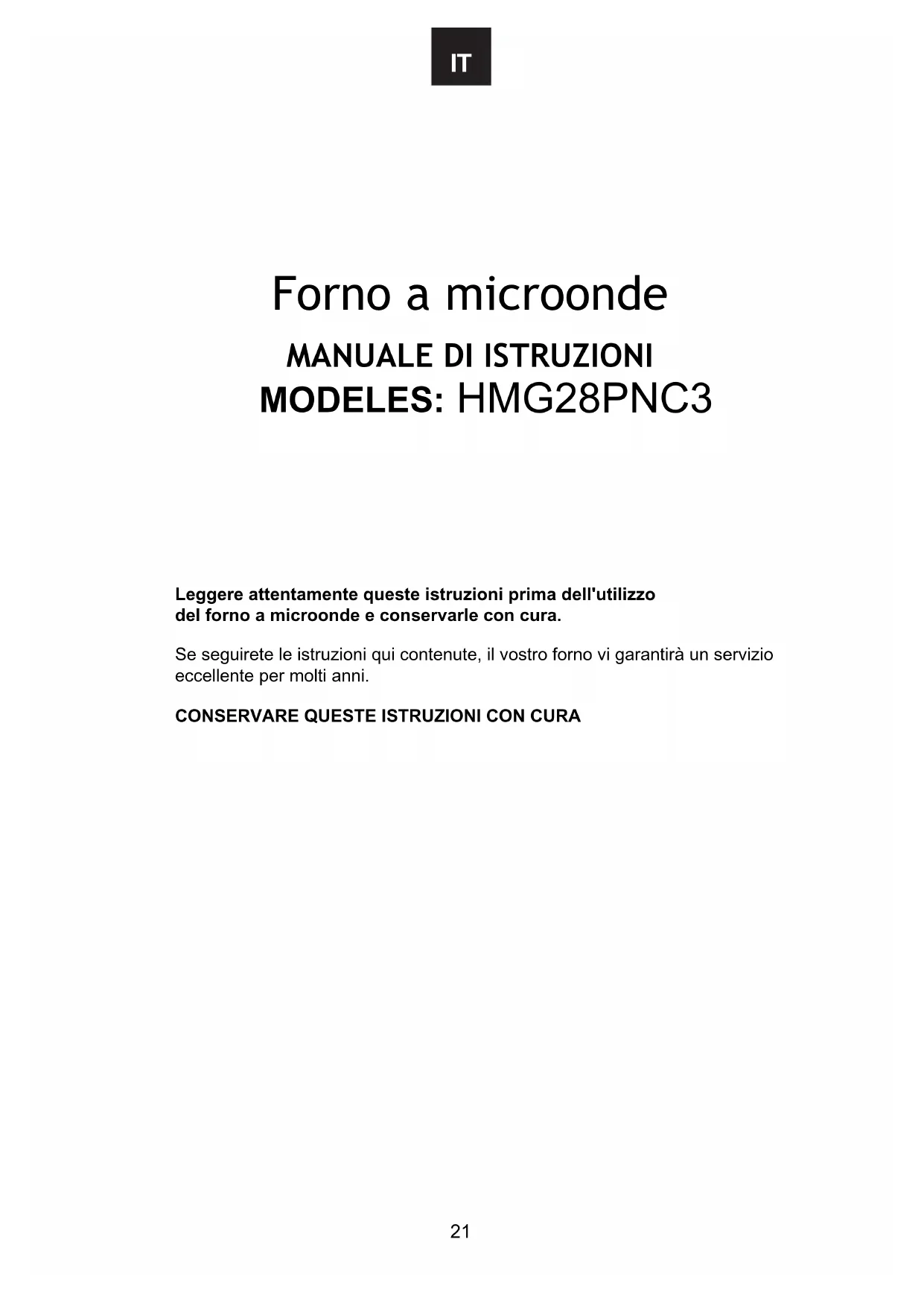 Leggere attentamente queste istruzioni prima dell'utilizzo del forno a microonde e conservarle con cura. Se seguirete le istruzioni qui contenute, il vostro forno vi garantirà un servizio eccellente per molti anni.CONSERVARE QUESTE ISTRUZIONI CON CURA