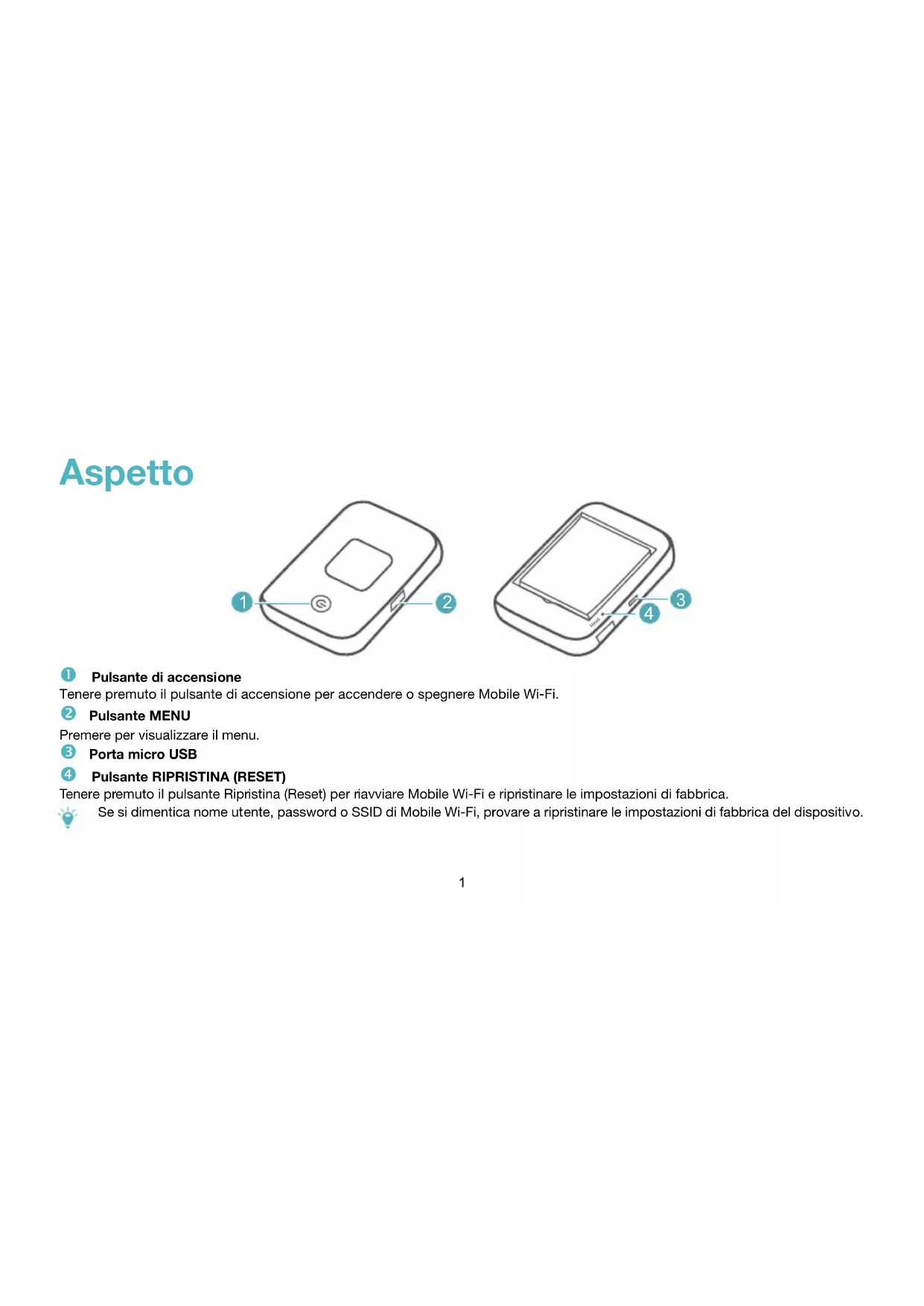 Pulsante di accensione Tenere premuto il pulsante di accensione per accendere o spegnere Mobile Wi-Fi. Pulsante MENU Premere per visualizzare il menu. Porta micro USB Pulsante RIPRISTINA (RESET) Tenere premuto il pulsante Ripristina (Reset) per riavviare Mobile Wi-Fi e ripristinare le impostazioni di fabbrica. Se si dimentica nome utente, password o SSID di Mobile Wi-Fi, provare a ripristinare le impostazioni di fabbrica del dispositivo.2 Installazione
