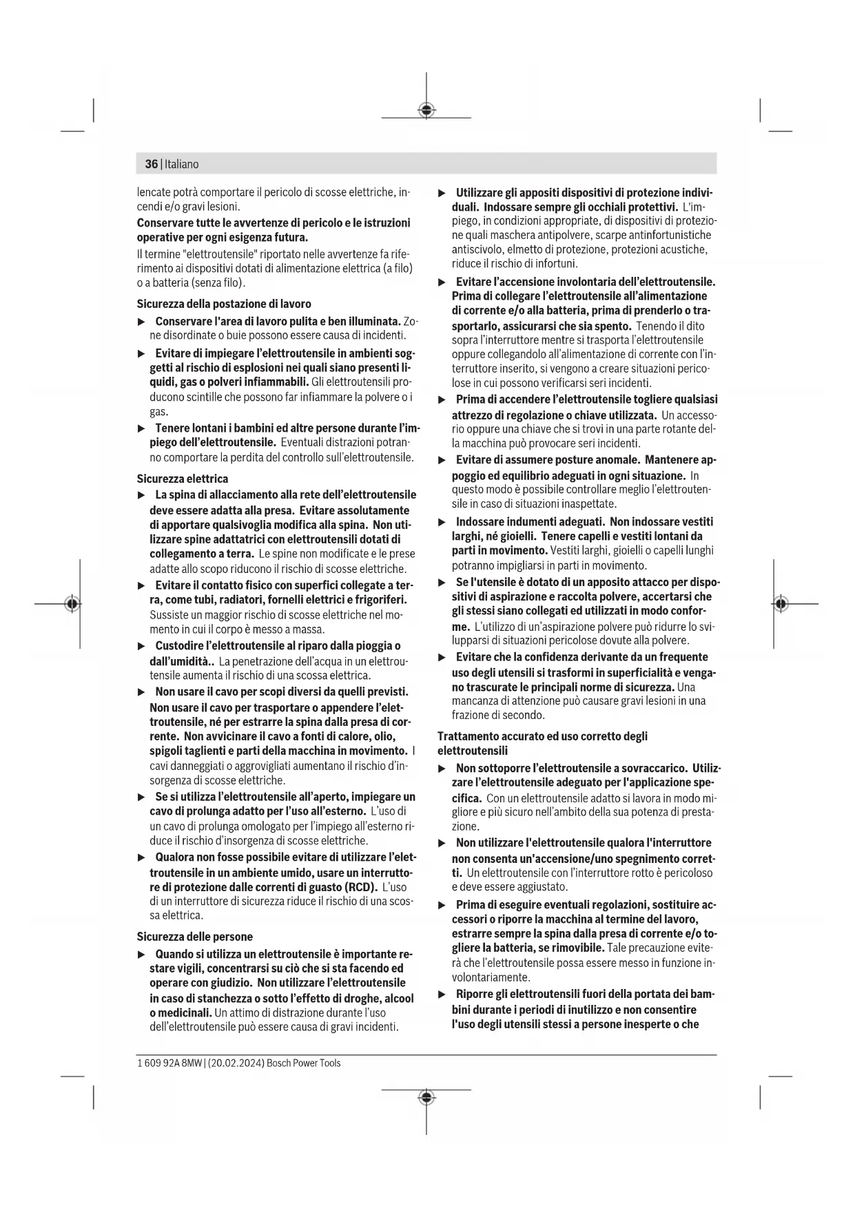 Il livello di vibrazione ed il valore di emissione acustica indi- cati nelle presenti istruzioni sono stati rilevati conformemen- te ad una procedura di misurazione unificata e sono utilizza- bili per confrontare gli elettroutensili. Le stesse procedure sono idonee anche per una valutazione temporanea del livel- lo di vibrazione e dell’emissione acustica. Il livello di vibrazione ed il valore di emissione acustica sono riferiti agli impieghi principali dell’elettroutensile; qualora, tuttavia, l’elettroutensile venisse utilizzato per altre applica- zioni, oppure con accessori differenti o in caso di insufficien- te manutenzione, il livello di vibrazione ed il valore di emis- sione acustica potrebbero variare. Ciò potrebbe aumentare sensibilmente l’emissione di vibrazioni e l’emissione acustica sull’intero periodo di funzionamento. 1 609 92A 8MW | (20.02.2024) Bosch Power ToolsItaliano | 39 Per valutare con precisione i valori di vibrazione e di emissio- ne acustica, andranno considerati anche i periodi nei quali l’utensile sia spento, oppure acceso, ma non utilizzato. Ciò potrebbe ridurre sensibilmente l’emissione di vibrazioni e l’emissione acustica sull’intero periodo di funzionamento. Adottare misure di sicurezza supplementari per proteggere l’operatore dall’effetto delle vibrazioni: ad esempio, sottopo- nendo a manutenzione l’elettroutensile e gli utensili accesso- ri, mantenendo calde le mani e organizzando i vari processi di lavoro. Montaggio u Prima di qualsiasi intervento sull’elettroutensile (ad es. per manutenzione, sostituzione dell’accessorio ecc.), prelevare la batteria. Qualora l’interruttore di av- vio/arresto venga premuto inavvertitamente, vi è rischio di lesioni. Ricarica della batteria u Utilizzare esclusivamente i caricabatterie indicati nei dati tecnici. Soltanto questi caricabatterie sono adatti al- le batterie al litio utilizzate nell’elettroutensile. Avvertenza: La batteria viene fornita solo parzialmente cari- ca. Per garantire l’intera potenza della batteria, prima dell’impiego iniziale, ricaricare completamente la batteria nell’apposito caricabatteria. La batteria al litio può essere ricaricata in qualsiasi momento senza ridurne la durata. Un’interruzione dell’operazione di ri- carica non danneggia la batteria. La batteria al litio è protetta contro lo scaricamento comple- to dal sistema «Electronic Cell Protection (ECP)». In caso di batteria scarica l’elettroutensile si spegne attraverso un in- terruttore automatico: l’accessorio non si muove più. u Dopo lo spegnimento automatico dell’elettroutensile, non premere ulteriormente l’interruttore di avvio/ar- resto. La batteria potrebbe subire danni. Per estrarre la batteria (11), premere il tasto di sbloccaggio (12) ed estrarre verso l’alto la batteria dall’elettroutensile. Durante questa operazione, non esercitare forza. Attenersi alle indicazioni relative allo smaltimento. Montaggio della piastra di base (vedere fig.A) Svitare completamente le 4 viti(14). Applicare una piastra di base di tipo adatto insieme alla piastra di levigatura e ser- rare nuovamente le viti. Sostituzione della piastra di levigatura (vedere Fig. A) All’occorrenza, la piastra di levigatura (3) si potrà sostituire. Svitare completamente le 4 viti(14) e prelevare la piastra di levigatura (3). Applicare la nuova piastra di levigatura (3) e serrare nuovamente le viti. Sostituzione degli utensili abrasivi Prima dell’applicazione di un nuovo foglio abrasivo, rimuove- re eventuale sporcizia e polvere dalla piastra di levigatura (3), utilizzando ad esempio un pennello. Al fine di garantire un’aspirazione della polvere ottimale, ac- certarsi che la punzonatura del foglio abrasivo coincida con i fori presenti sulla piastra di levigatura. Fogli abrasivi senza fissaggio a strappo (vedere Figg. B–