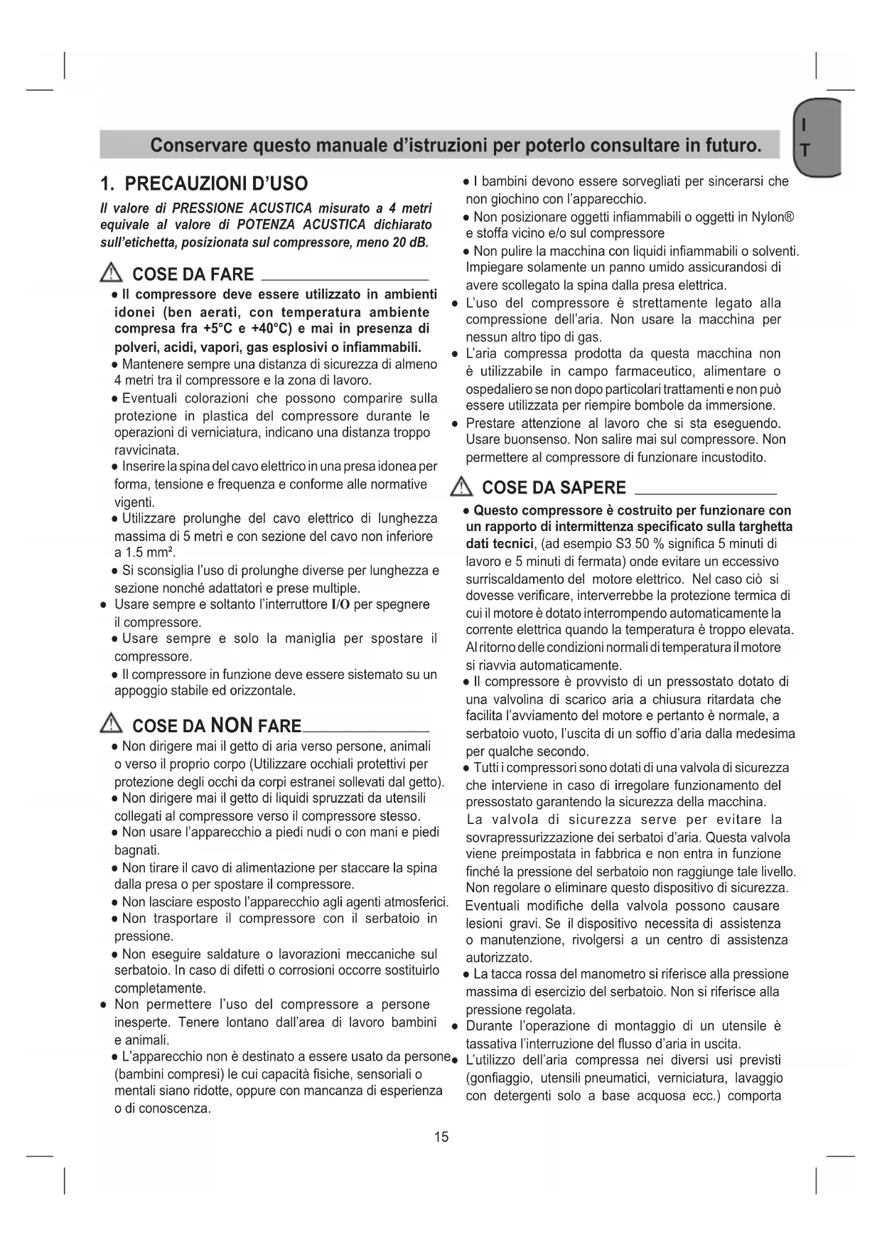 ● Questo compressore è costruito per funzionare con un rapporto di intermittenza specicato sulla targhetta dati tecnici, (ad esempio S3 50 % signica 5 minuti di lavoro e 5 minuti di fermata) onde evitare un eccessivo surriscaldamento del motore elettrico. Nel caso ciò si dovesse vericare, interverrebbe la protezione termica di cui il motore è dotato interrompendo automaticamente la corrente elettrica quando la temperatura è troppo elevata. Al ritorno delle condizioni normali di temperatura il motore si riavvia automaticamente. ● Il compressore è provvisto di un pressostato dotato di una valvolina di scarico aria a chiusura ritardata che facilita l’avviamento del motore e pertanto è normale, a serbatoio vuoto, l’uscita di un sofo d’aria dalla medesima per qualche secondo. ● Tutti i compressori sono dotati di una valvola di sicurezza che interviene in caso di irregolare funzionamento del pressostato garantendo la sicurezza della macchina. La valvola di sicurezza serve per evitare la sovrapressurizzazione dei serbatoi d’aria. Questa valvola viene preimpostata in fabbrica e non entra in funzione nché la pressione del serbatoio non raggiunge tale livello. Non regolare o eliminare questo dispositivo di sicurezza. Eventuali modiche della valvola possono causare lesioni gravi. Se il dispositivo necessita di assistenza o manutenzione, rivolgersi a un centro di assistenza autorizzato. ● La tacca rossa del manometro si riferisce alla pressione massima di esercizio del serbatoio. Non si riferisce alla pressione regolata. ● Durante l’operazione di montaggio di un utensile è tassativa l’interruzione del usso d’aria in uscita. ● L’utilizzo dell’aria compressa nei diversi usi previsti (gonaggio, utensili pneumatici, verniciatura, lavaggio con detergenti solo a base acquosa ecc.) comporta Conservare questo manuale d’istruzioni per poterlo consultare in futuro.I