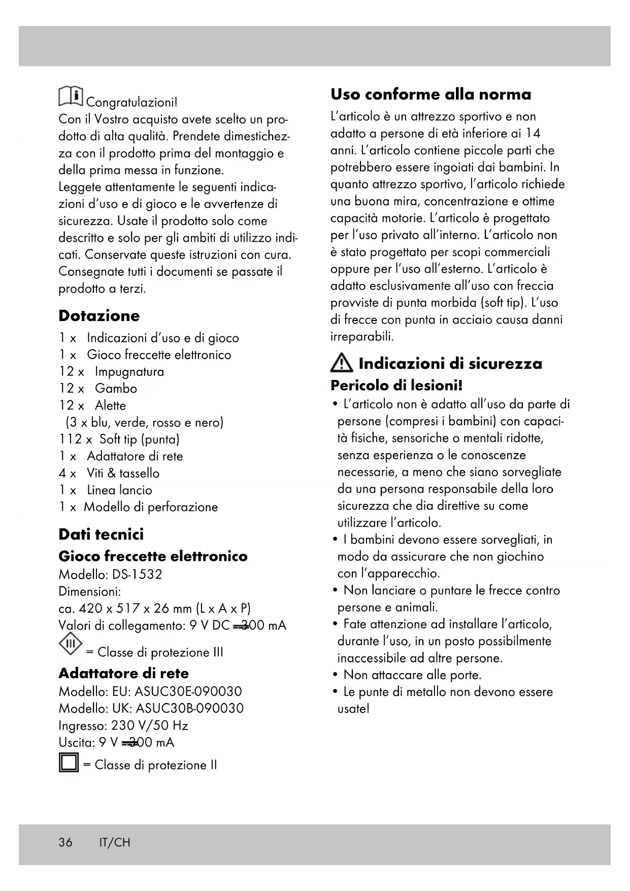 - Staccate l’adattatore di rete dalla corrente, prima di staccare il collega- mento fra l’adattatore di rete e il bersa- glio per le freccette!
