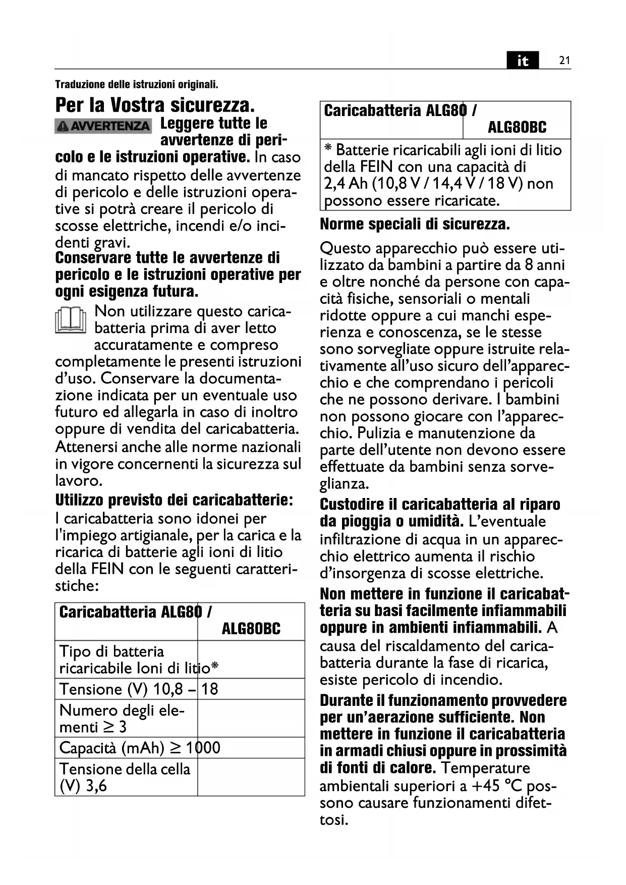 Traduzione delle istruzioni originali. Per la Vostra sicurezza. Leggere tutte le avvertenze di peri- colo e le istruzioni operative. In caso di mancato rispetto delle avvertenze di pericolo e delle istruzioni opera- tive si potrà creare il pericolo di scosse elettriche, incendi e/o inci- denti gravi. Conservare tutte le avvertenze di pericolo e le istruzioni operative per ogni esigenza futura. Non utilizzare questo carica- batteria prima di aver letto accuratamente e compreso completamente le presenti istruzioni d’uso. Conservare la documenta- zione indicata per un eventuale uso futuro ed allegarla in caso di inoltro oppure di vendita del caricabatteria. Attenersi anche alle norme nazionali in vigore concernenti la sicurezza sul lavoro. Utilizzo previsto dei caricabatterie: I caricabatteria sono idonei per l'impiego artigianale, per la carica e la ricarica di batterie agli ioni di litio della FEIN con le seguenti caratteri- stiche: Norme speciali di sicurezza. Questo apparecchio può essere uti- lizzato da bambini a partire da 8 anni e oltre nonché da persone con capa- cità fisiche, sensoriali o mentali ridotte oppure a cui manchi espe- rienza e conoscenza, se le stesse sono sorvegliate oppure istruite rela- tivamente all’uso sicuro dell’apparec- chio e che comprendano i pericoli che ne possono derivare. I bambini non possono giocare con l’apparec- chio. Pulizia e manutenzione da parte dell’utente non devono essere effettuate da bambini senza sorve- glianza. Custodire il caricabatteria al riparo da pioggia o umidità. L’eventuale infiltrazione di acqua in un apparec- chio elettrico aumenta il rischio d’insorgenza di scosse elettriche. Non mettere in funzione il caricabat- teria su basi facilmente infiammabili oppure in ambienti infiammabili. A causa del riscaldamento del carica- batteria durante la fase di ricarica, esiste pericolo di incendio. Durante il funzionamento provvedere per un’aerazione sufficiente. Non mettere in funzione il caricabatteria in armadi chiusi oppure in prossimità di fonti di calore. Temperature ambientali superiori a +45 °C pos- sono causare funzionamenti difet- tosi. Caricabatteria ALG80 / ALG80BC Tipo di batteria ricaricabile Ioni di litio* Tensione (V) 10,8 – 18 Numero degli ele- menti ≥ 3 Capacità (mAh) ≥ 1000 Tensione della cella (V) 3,6