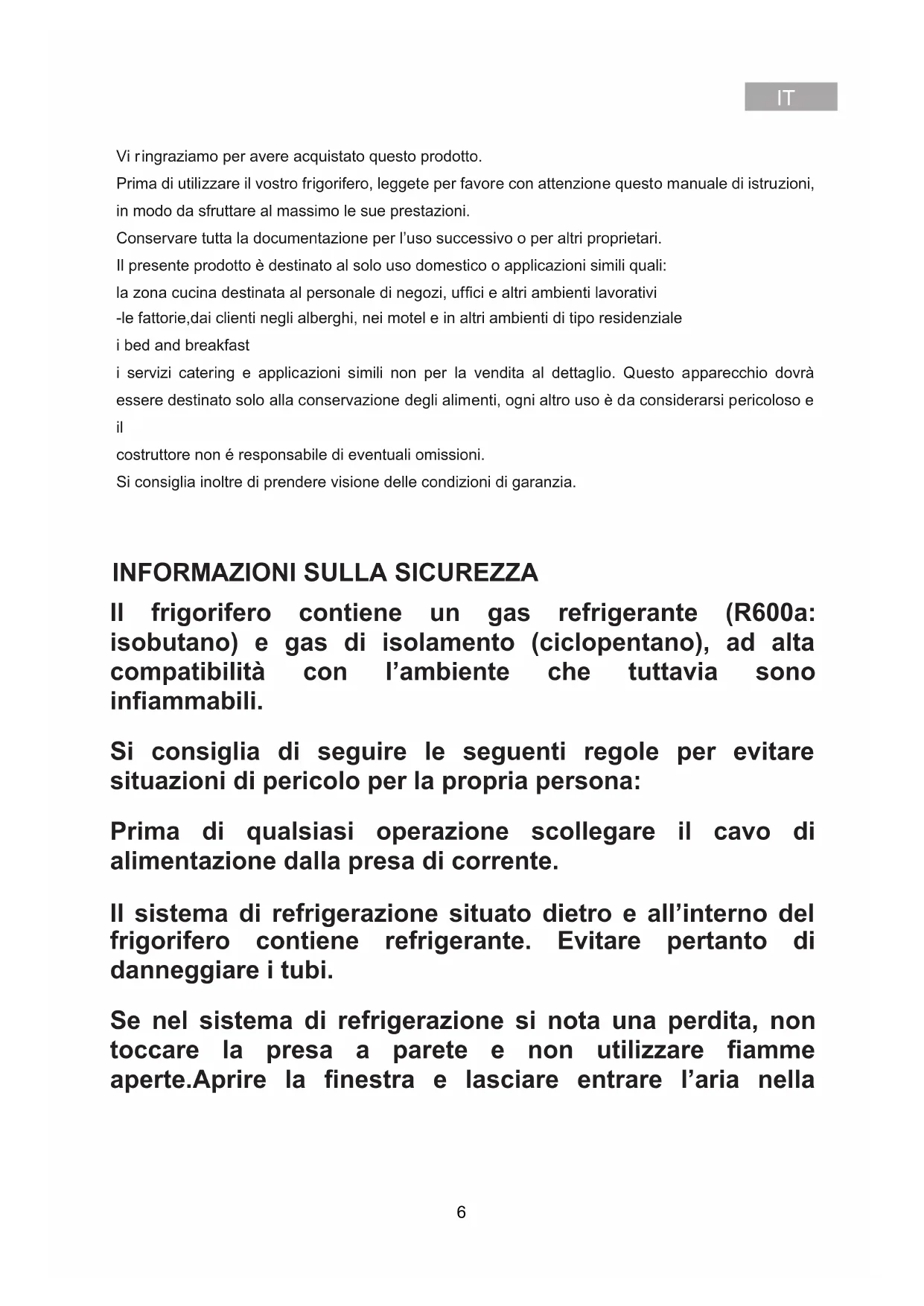 Il frigorifero contiene un gas refrigerante (R600a: isobutano) e gas di isolamento (ciclopentano), ad alta compatibilità con l’ambiente che tuttavia sono infiammabili. Si consiglia di seguire le seguenti regole per evitare situazioni di pericolo per la propria persona: Prima di qualsiasi operazione scollegare il cavo di alimentazione dalla presa di corrente. Il sistema di refrigerazione situato dietro e all’interno del frigorifero contiene refrigerante. Evitare pertanto di danneggiare i tubi. Se nel sistema di refrigerazione si nota una perdita, non toccare la presa a parete e non utilizzare fiamme aperte.Aprire la finestra e lasciare entrare l’aria nella 6stanza. Ri volgersi quindi a un centro di assistenza per richiedere la riparazione. Non raschiare con un coltello o oggetto acuminato per eliminare la brina o il ghiaccio presente. Con questi si può danneggiare il circuito refrigerante, la cui fuoriuscita può causare un incendio o danneggiare gli occhi. Non installare l’elettrodomestico in luoghi umidi, unti o polverosi né esporlo alla luce diretta del sole e all’acqua. Non installare l’elettrodomestico vicino a stufette o materiali infiammabili. Non utilizzare prolunghe o adattatori. Non tirare né piegare eccessivamente il cavo di alimentazione o toccare la spina con le mani bagnate. Non danneggiare la spina e/o il cavo di alimentazione, questo potrebbe causare scosse elettriche o incendi. Si consiglia di tenere pulita la spina, eventuali residui eccessivi di polvere sulla spina possono essere causa di incendio. Non utilizzare dispositivi meccanici o altri apparecchi per accelerare il processo di sbrinamento. Evitare assolutamente l’uso di fiamma aperta o di apparecchi elettrici, come apparecchi di riscaldamento, pulitrici a vapore, candele, lampade a petrolio e simili per accelerare la fase di sbrinamento. Non utilizzare o conservare spray infiammabili, come vernici spray vicino al frigorifero. Potrebbero causare esplosioni o incendi. 7Non usare apparecchi elettrici all’interno degli scomparti per la conservazione dei cibi, se questi non sono del tipo raccomandato dal costruttore. Non riporre o conservare materiali infiammabili e altamente volatili come etere, benzina, GPL, gas propano, bombolette spray, collanti, alcool puro, ecc. Questi materiali potrebbero provocare esplosioni. Non conservare medicine o materiali di ricerca nel frigorifero. Quando il materiale che necessita di un controllo rigido delle temperature di conservazione viene conservato, è possibile che si deteriori o si può verificare una reazione incontrollata che può provocare rischi. Mantenere libere da ostruzioni le aperture di ventilazione nell’involucro dell’apparecchio o nella struttura ad incasso. Non collocare oggetti e/o recipienti pieni d’acqua sopra l’elettrodomestico, Evitate di effettuare interventi su questo frigorifero. Ogni intervento deve essere eseguito solo da personale tecnico specializzato. Questo elettrodomestico non dovrà essere destinato a persone (compresi bambini) con handicap fisici, sensoriali, mentali, o mancanti di esperienza o conoscenza d’ uso, senza la supervisione di persone che abbiano preso visione delle istruzioni d’uso e che siano direttamente responsabili della loro sicurezza. Accertarsi che i bambini non giochino vicino all’elettrodomestico per preservare la loro sicurezza. 8Qu