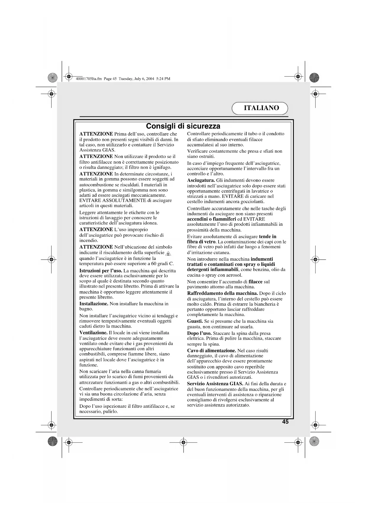 Consigli di sicurezza ATTENZIONE Prima dell’uso, controllare che il prodotto non presenti segni visibili di danni. In tal caso, non utilizzarlo e contattare il Servizio Assistenza GIAS. ATTENZIONE Non utilizzare il prodotto se il filtro antifilacce non è correttamente posizionato o risulta danneggiato; il filtro non è ignifugo. ATTENZIONE In determinate circostanze, i materiali in gomma possono essere soggetti ad autocombustione se riscaldati. I materiali in plastica, in gomma e similgomma non sono adatti ad essere asciugati meccanicamente. EVITARE ASSOLUTAMENTE di asciugare articoli in questi materiali. Leggere attentamente le etichette con le istruzioni di lavaggio per conoscere le caratteristiche dell’asciugatura idonea. ATTENZIONE L’uso improprio dell’asciugatrice può provocare rischio di incendio. ATTENZIONE Nell’ubicazione del simbolo indicante il riscaldamento della superficie , quando l’asciugatrice è in funzione la temperatura può essere superiore a 60 gradi C. Istruzioni per l’uso. La macchina qui descritta deve essere utilizzata esclusivamente per lo scopo al quale è destinata secondo quanto illustrato nel presente libretto. Prima di attivare la macchina è opportuno leggere attentamente il presente libretto. Installazione. Non installare la macchina in bagno. Non installare l’asciugatrice vicino ai tendaggi e rimuovere tempestivamente eventuali oggetti caduti dietro la macchina. Ventilazione. Il locale in cui viene installata l’asciugatrice deve essere adeguatamente ventilato onde evitare che i gas provenienti da apparecchiature funzionanti con altri combustibili, comprese fiamme libere, siano aspirati nel locale dove l’asciugatrice è in funzione. Non scaricare l’aria nella canna fumaria utilizzata per lo scarico di fumi provenienti da attrezzature funzionanti a gas o altri combustibili. Controllare periodicamente che nell’asciugatrice vi sia una buona circolazione d’aria, senza impedimenti di sorta: Dopo l’uso ispezionare il filtro antifilacce e, se necessario, pulirlo. Controllare periodicamente il tubo o il condotto di sfiato eliminando eventuali filacce accumulatesi al suo interno. Verificare costantemente che presa e sfiati non siano ostruiti. In caso d’impiego frequente dell’asciugatrice, accorciare opportunamente l’intervallo fra un controllo e l’altro. Asciugatura. Gli indumenti devono essere introdotti nell’asciugatrice solo dopo essere stati opportunamente centrifugati in lavatrice o strizzati a mano. EVITARE di caricare nel cestello indumenti ancora gocciolanti. Controllare accuratamente che nelle tasche degli indumenti da asciugare non siano presenti accendini o fiammiferi ed EVITARE assolutamente l’uso di prodotti infiammabili in prossimità della macchina. Evitare assolutamente di asciugare tende in fibra di vetro. La contaminazione dei capi con le fibre di vetro può infatti dar luogo a fenomeni d’irritazione cutanea. Non introdurre nella macchina indumenti trattati o contaminati con spray o liquidi detergenti infiammabili, come benzina, olio da cucina o spray con aerosol. Non consentire l’accumulo di filacce sul pavimento attorno alla macchina. Raffreddamento della macchina. Dopo il ciclo di asciugatura, l’interno del cestello può essere molto caldo. Prima di estrarre la biancheria è pertanto opportuno lasciar raffreddare completamente la macchina. Guasti. Se si presume che la macchina sia guasta, non continuare ad usarla. Dopo l’uso. Staccare la spina dalla presa elettrica. Prima di pulire la macchina, staccare sempre la spina. Cavo di alimentazione. Nel caso risulti danneggiato, il cavo di alimentazione dell’apparecchio deve essere prontamente sostituito con apposito cavo reperibile esclusivamente presso il Servizio Assistenza GIAS o i rivenditori autorizzati. Servizio Assistenza GIAS. Ai fini della durata e del buon funzionamento della macchina, per gli eventuali interventi di assistenza o riparazione consigliamo di rivolgersi esclusivamente al servizio assistenza autorizzato. 40001705Ita.fm Page 45 Tuesday, July 6, 2004 5:24 PMITALIANO
