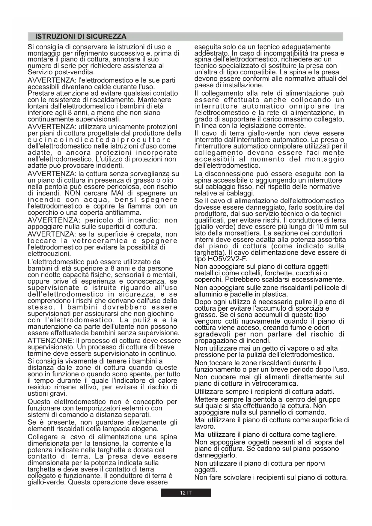 If error has occurred disconnected and connect again the cooktop to the powersupply.Iferror persist, call after-sales service. If error appears suddenlyina normaloperation, callafter-sales service. Touch control software error. Wait until temperature goes down. Cook-top will automatically recovered when temperature reaches a normal value. Touch control zone is too hot and has turned off all the heaters. Wait until temperature goes down. If message persist when temperature reaches an environment value, call after-sales service. Touch control temperature sensor can be damaged. Wait until temperature goes down. If message persist when temperature reaches an environment value, call after-sales service. Touch control temperature sensor can be damaged. See if cook-top is mounted correctly. Be sure that keys touch correctly the glass surface. Excessive sensitivity on any key. This error is a keyboard auto-check. It disappears when autocheck return to secure value. If error persist, call after-sale service. Security keyboard error This error is a software auto-check. It disappears when auto-check return to secure value. If error persist, call after-sale service. Security software error This error is a software auto-check. It disappears when auto-check return to secure value. If error persist, call after-sale service. Security software error Any relay driver can have any problemn. Remove cook-top from the power supply, wait a minute and switch on again. If error persist, call after-sale service. Relays security error 11 GB12 IT Si consiglia di conservare le istruzioni di uso e montaggio per riferimento successivo e, prima di montare il piano di cottura, annotare il suo numero di serie per richiedere assistenza al Servizio post-vendita. AVVERTENZA: l'elettrodomestico e le sue parti accessibili diventano calde durante l'uso. Prestare attenzione ad evitare qualsiasi contatto con le resistenze di riscaldamento. Mantenere lontani dall'elettrodomestico i bambini di età inferiore agli 8 anni, a meno che non siano continuamente supervisionati. AVVERTENZA: utilizzare unicamente protezioni per piani di cottura progettate dal produttore della c u c i n a o i n d i c a t e d a l p r o d u t t o r e dell'elettrodomestico nelle istruzioni d'uso come adatte, o ancora protezioni incorporate nell'elettrodomestico. L'utilizzo di protezioni non adatte può provocare incidenti. AVVERTENZA: la cottura senza sorveglianza su un piano di cottura in presenza di grasso o olio nella pentola può essere pericolosa, con rischio di incendi. NON cercare MAI di spegnere un incendio con acqua, bensì spegnere l'elettrodomestico e coprire la fiamma con un coperchio o una coperta antifiamma. AVVERTENZA: se la superficie è crepata, non tocca re la ve tro cer ami ca e spe gne re l'elettrodomestico per evitare la possibilità di elettrocuzioni. AVVERTENZA: pericolo di incendio: non appoggiare nulla sulle superfici di cottura. L'elettrodomestico può essere utilizzato da bambini di età superiore a 8 anni e da persone con ridotte capacità fisiche, sensoriali o mentali, oppure prive di esperienza e conoscenza, se supervisionate o istruite riguardo all'uso dell'elettrodomestico in sicurezza, e se comprendono i rischi che derivano dall'uso dello st e sso . I ba m bin i dov r ebb e ro esse r e supervisionati per assicurarsi che non giochino con l'elettrodomestico. La pulizia e la manutenzione da parte dell'utente non possono essere effettuate da bambini senza supervisione. ATTENZIONE: il processo di cottura deve essere supervisionato. Un processo di cottura di breve termine deve essere supervisionato in continuo. Si consiglia vivamente di tenere i bambini a distanza dalle zone di cottura quando queste sono in funzione o quando sono spente, per tutto il tempo durante il quale l'indicatore di calore residuo rimane attivo, per evitare il rischio di ustioni gravi. Questo elettrodomestico non è concepito per funzionare con temporizzatori esterni o con sistemi di comando a distanza separati. Se è presente, non guardare direttamente gli elementi riscaldati della lampada alogena. Collegare al cavo di alimentazione una spina dimensionata per la tensione, la corrente e la potenza indicate nella targhetta e dotata del contatto di terra. La presa deve essere dimensionata per la potenza indicata sulla targhetta e deve avere il contatto di terra collegato e funzionante. Il conduttore di terra è giallo-verde. Questa operazione deve essere