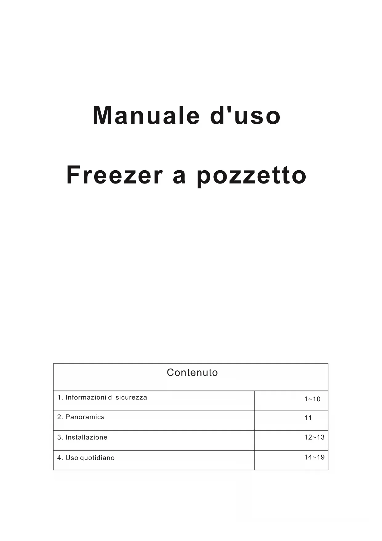 14~19 Manuale d'uso Freezer a pozzettoVi ringraziamo per aver scelto questo nostro prodotto. Prima di utilizzare il frigorifero, leggere il presente manuale di istruzioni per massimizzare le prestazioni del prodotto. Riporre tutta la documentazione per utilizzo futuro o per i successivi proprietari. Questo apparecchio è destinato unicamente in ambiente domestico o per applicazioni simili quali: - La zona cucina destinata al personale di negozi, uffici e altri ambienti lavorativi - Di beauty farm, alla clientela di hotel, motel e altri ambienti di tipo residenziale - Nei Bed&Breafast (B&B) - Per servizi di catering ed applicazioni simili esclusa la vendita al dettaglio. Questo elettrodomestico deve essere utilizzato unicamente per la conservazione degli alimenti; qualsiasi altro uso è considerato pericoloso e il produttore non è ritenuto responsabile per eventuali omissioni. Si consiglia anche di leggere con attenzione le condizioni di garanzia.