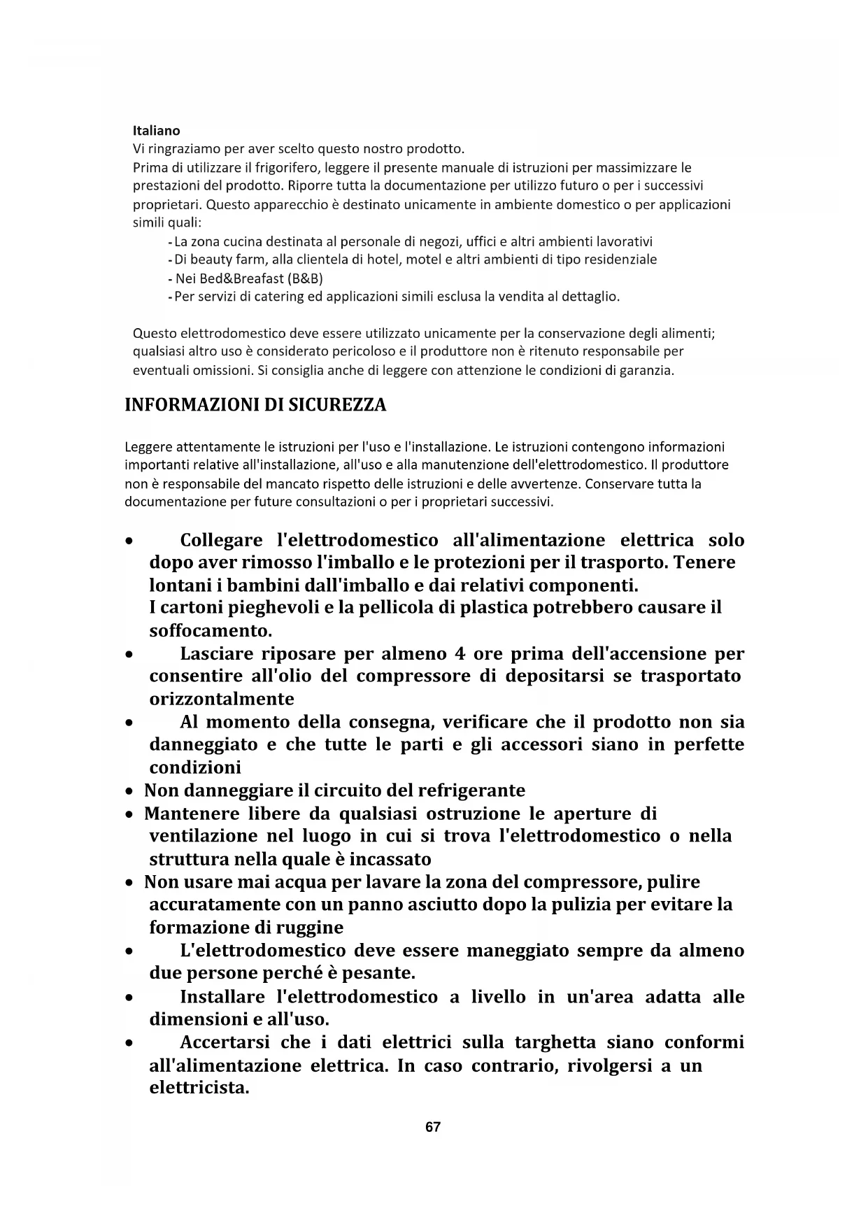 Pour plus d'informations sur le produit, veuillez consulter https://eprel.ec.europa.eu/ ou scannez le QR sur l'étiquette énergétique fournie avec l'appareil67 Italiano Vi ringraziamo per aver scelto questo nostro prodotto. Prima di utilizzare il frigorifero, leggere il presente manuale di istruzioni per massimizzare le prestazioni del prodotto. Riporre tutta la documentazione per utilizzo futuro o per i successivi proprietari. Questo apparecchio è destinato unicamente in ambiente domestico o per applicazioni simili quali: - La zona cucina destinata al personale di negozi, uffici e altri ambienti lavorativi - Di beauty farm, alla clientela di hotel, motel e altri ambienti di tipo residenziale - Nei Bed&Breafast (B&B) - Per servizi di catering ed applicazioni simili esclusa la vendita al dettaglio. Questo elettrodomestico deve essere utilizzato unicamente per la conservazione degli alimenti; qualsiasi altro uso è considerato pericoloso e il produttore non è ritenuto responsabile per eventuali omissioni. Si consiglia anche di leggere con attenzione le condizioni di garanzia.