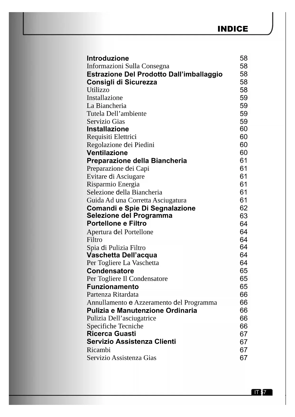 66Problemi che può risolvere l’utente Prima di rivolgersi al Centro Assistenza GIAS, consultare la seguente checklist. La chiamata verrà addebitata all'utente nel caso in cui risulti che la macchina funziona o è stata installata o utilizzata in maniera errata. Se il problema persiste anche dopo aver eseguito i controlli consigliati, rivolgersi al servizio di assistenza GIAS che sarà a disposizione per suggerire eventuali soluzioni per telefono. Tempo di asciugatura eccessivamente lungo/capi non sufficientemente asciutti… ● Il programma/tempo di asciugatura selezionato è corretto? ● I capi sono stati introdotti eccessivamente bagnati? Si è provveduto a strizzare o centrifugare adeguatamente i capi prima d’introdurli nella macchina? ● Si deve pulire il filtro? ● Si deve pulire il condensatore? ●L’asciugatrice è stata caricata eccessivamente? ● Vi sono ostruzioni a livello delle prese, degli sfiati e della base dell’asciugatrice? ● Il tasto è stato selezionato da un ciclo precedente? L’asciugatrice non funziona… ● L’alimentazione elettrica cui è collegata la macchina è attiva? Controllare provando con un altro apparecchio (ad esempio, lampada da tavolo). ● La spina di alimentazione è stata collegata correttamente all’alimentazione elettrica? ● Manca la corrente? ● Fusibile bruciato? ● Il portellone è stato chiuso perfettamente? ●La macchina è stata opportunamente attivata (sia collegata all’alimentazione sia attivata localmente)? ● È stato selezionato il tempo o il programma di asciugatura? ●La macchina è stata riattivata dopo aver aperto il portellone? ● La macchina ha smesso di funzionare perché la vaschetta dell’acqua è piena e deve essere svuotata? L’asciugatrice fa molto rumore… ● Spegnere l’asciugatrice e rivolgersi al Servizio Assistenza GIAS. La spia di segnalazione è accesa… ● Si deve pulire il filtro? ● Si deve pulire il condensatore? La spia di segnalazione è accesa… ● Si deve svuotare la vaschetta dell’acqua? Se il problema persiste anche dopo aver effettuato tutti icontrolli consigliati, rivolgersi al Servizio Assistenza GIAS. Sarà a disposizione per suggerire eventuali soluzioni per telefono o per fissare la visita del tecnico in base alle condizioni di garanzia. Si ricorda che l’intervento del tecnico può essere soggetto a pagamento nel caso la macchina: ● risulti perfettamente funzionante. ● non sia stata installata secondo quanto indicato nelle istruzioni d’installazione. ● sia stata utilizzata in modo improprio. Utilizzare sempre ricambi originali, disponibili direttamente presso il Servizio Assistenza GIAS. Per assistenza e riparazioni, rivolgersi al tecnico del Servizio Assistenza GIAS più vicino. Il produttore declina ogni responsabilità in caso di eventuali errori di stampa nel presente opuscolo. Il produttore si riserva il diritto di apportare le necessarie modifiche ai propri prodotti, senza alterarne le caratteristiche essenziali. RICERCA GUASTI Quale Può Essere La Causa...