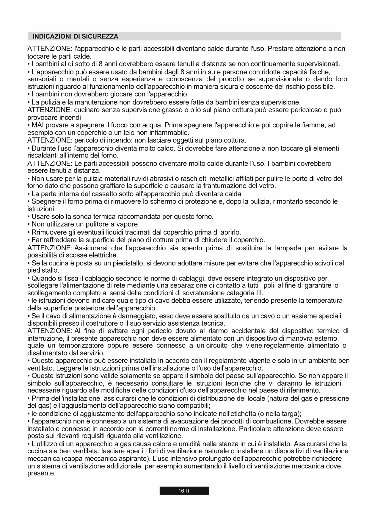 - L'utilizzo di un apparecchio a gas causa calore e umidità nella stanza in cui è installato. Assicurarsi che la cucina sia ben ventilata: lasciare aperti i fori di ventilazione naturale o installare un dispositivi di ventilazione meccanica (cappa meccanica aspirante). L'uso intensivo prolungato dell'apparecchio potrebbe richiedere un sistema di ventilazione addizionale, per esempio aumentando il livello di ventilazione meccanica dove presente.