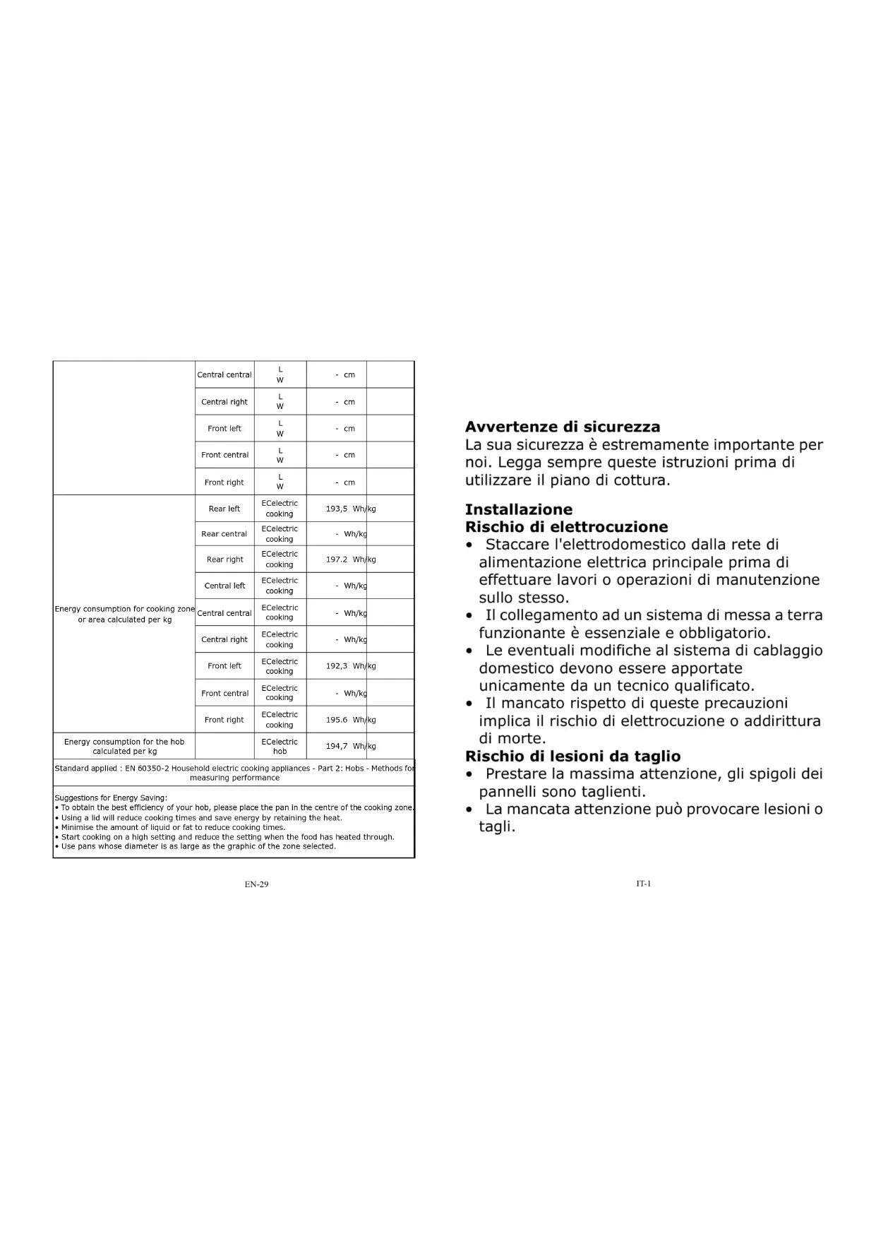 Celectric hob 194,7 Peso/kg Norma applicata: EN 60350-2 Apparecchi di cottura elettrici per uso domestico - Parte 2: Piani cottura - Metodi di misurazione delle prestazioni Consigli per il risparmio energetico: