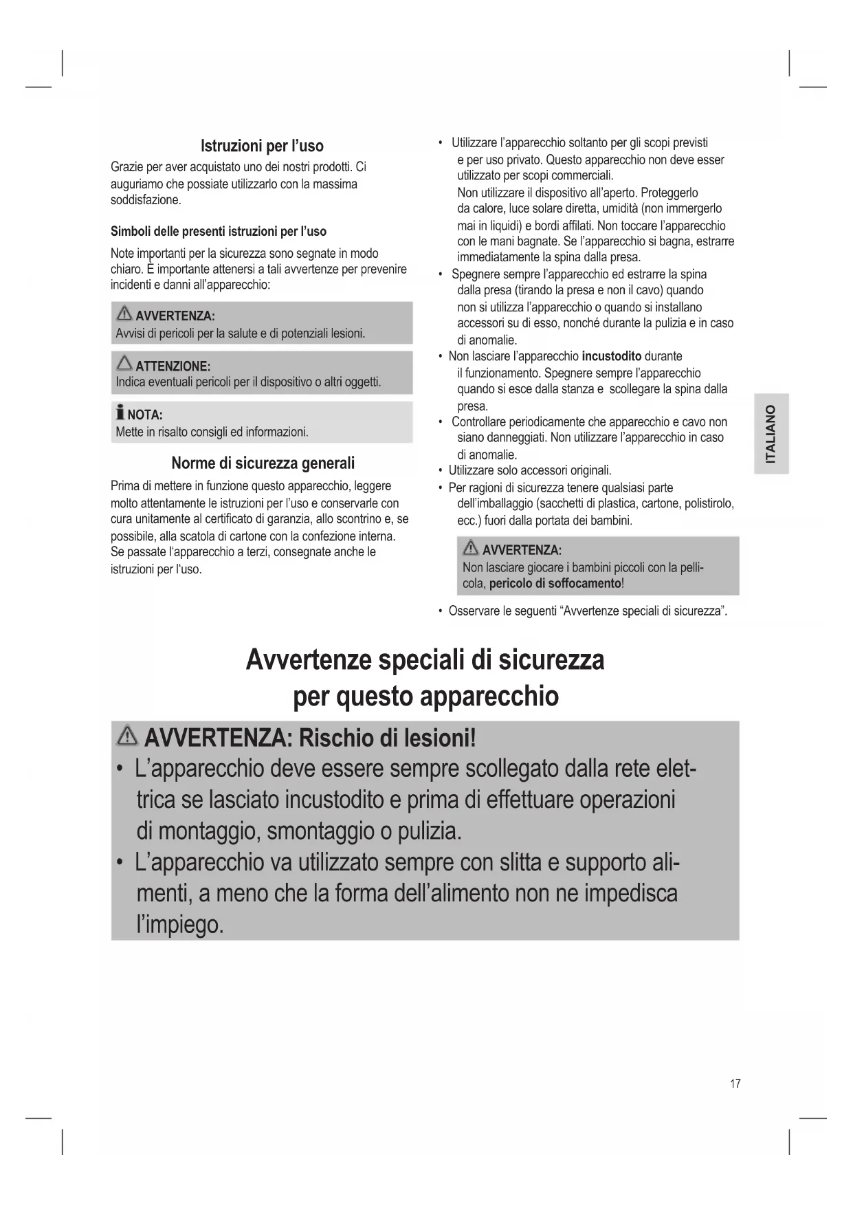 - Osservare le seguenti “Avvertenze speciali di sicurezza”. Avvertenze speciali di sicurezza per questo apparecchio AVVERTENZA: Rischio di lesioni!