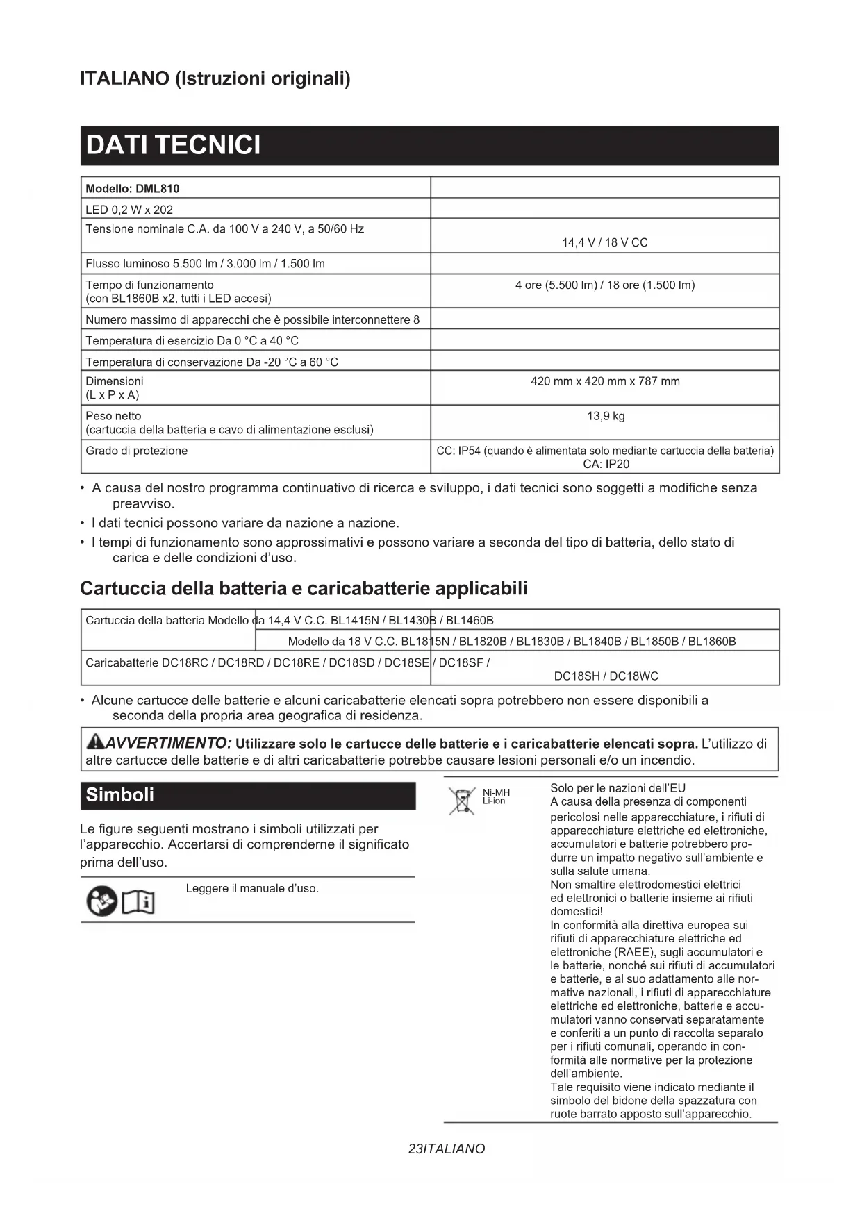 - Alcune cartucce delle batterie e alcuni caricabatterie elencati sopra potrebbero non essere disponibili a seconda della propria area geograca di residenza. AVVERTIMENTO: Utilizzare solo le cartucce delle batterie e i caricabatterie elencati sopra. L’utilizzo di altre cartucce delle batterie e di altri caricabatterie potrebbe causare lesioni personali e/o un incendio. Simboli Le gure seguenti mostrano i simboli utilizzati per l’apparecchio. Accertarsi di comprenderne il signicato prima dell’uso. Leggere il manuale d’uso. Ni-MH Li-ion Solo per le nazioni dell’EU A causa della presenza di componenti pericolosi nelle apparecchiature, i riuti di apparecchiature elettriche ed elettroniche, accumulatori e batterie potrebbero pro- durre un impatto negativo sull’ambiente e sulla salute umana. Non smaltire elettrodomestici elettrici ed elettronici o batterie insieme ai riuti domestici! In conformità alla direttiva europea sui riuti di apparecchiature elettriche ed elettroniche (RAEE), sugli accumulatori e le batterie, nonché sui riuti di accumulatori e batterie, e al suo adattamento alle nor- mative nazionali, i riuti di apparecchiature elettriche ed elettroniche, batterie e accu- mulatori vanno conservati separatamente e conferiti a un punto di raccolta separato per i riuti comunali, operando in con- formità alle normative per la protezione dell’ambiente. Tale requisito viene indicato mediante il simbolo del bidone della spazzatura con ruote barrato apposto sull’apparecchio.24 ITALIANO Adottare cura e attenzione particolari. Radiazione ottica (UV e IR). Ridurre al minimo l’esposizione degli occhi o della pelle. Non ssare lo sguardo sulla lampada accesa. Utilizzare una schermatura appropriata o una protezione per gli occhi. Non utilizzare l’apparecchio sotto la piog- gia o la neve quando si utilizza l’alimenta- zione CA. Pulsante di riarmo dell’interruttore automatico. Nota Questo prodotto contiene fonti di luce con ecienza energetica delle classi <C> e <D>. Alimentazione L’utensile va collegato esclusivamente a una fonte di alimentazione con una tensione identica a quella indicata sulla targhetta di identicazione, e può venire fatto funzionare solo con alimentazione CA monofase. Questo utensile va collegato a terra durante l’uso, per proteggere l’operatore dalle scosse elettriche. Utilizzare esclusivamente cavi di prolunga tripolari dotati di spine tripolari con messa a terra, nonché prese elettriche tripolari compatibili con la spina dell’utensile. AVVERTENZE DI SICUREZZA