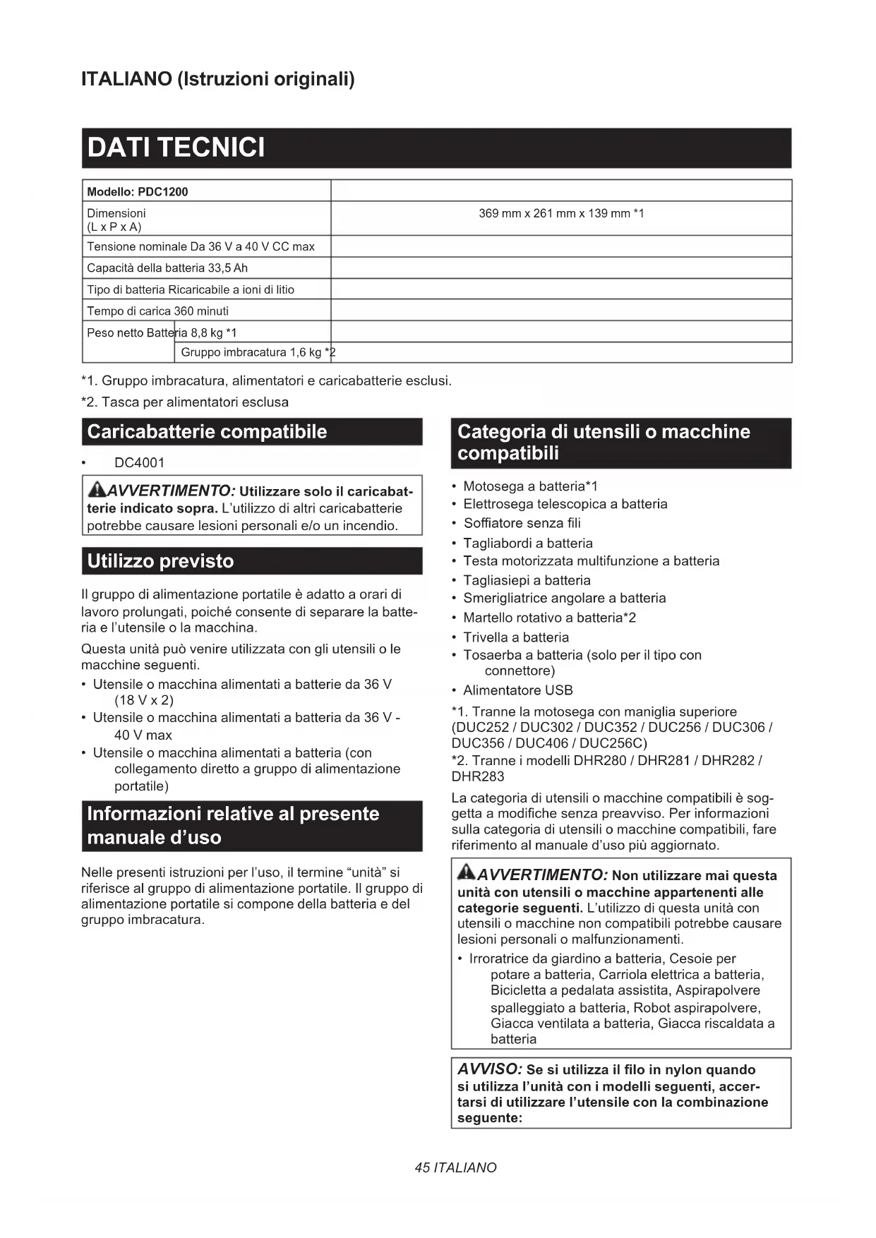 DUC356 / DUC406 / DUC256C) *2. Tranne i modelli DHR280 / DHR281 / DHR282 / DHR283 La categoria di utensili o macchine compatibili è sog- getta a modiche senza preavviso. Per informazioni sulla categoria di utensili o macchine compatibili, fare riferimento al manuale d’uso più aggiornato. AVVERTIMENTO: Non utilizzare mai questa unità con utensili o macchine appartenenti alle categorie seguenti. L’utilizzo di questa unità con utensili o macchine non compatibili potrebbe causare lesioni personali o malfunzionamenti.