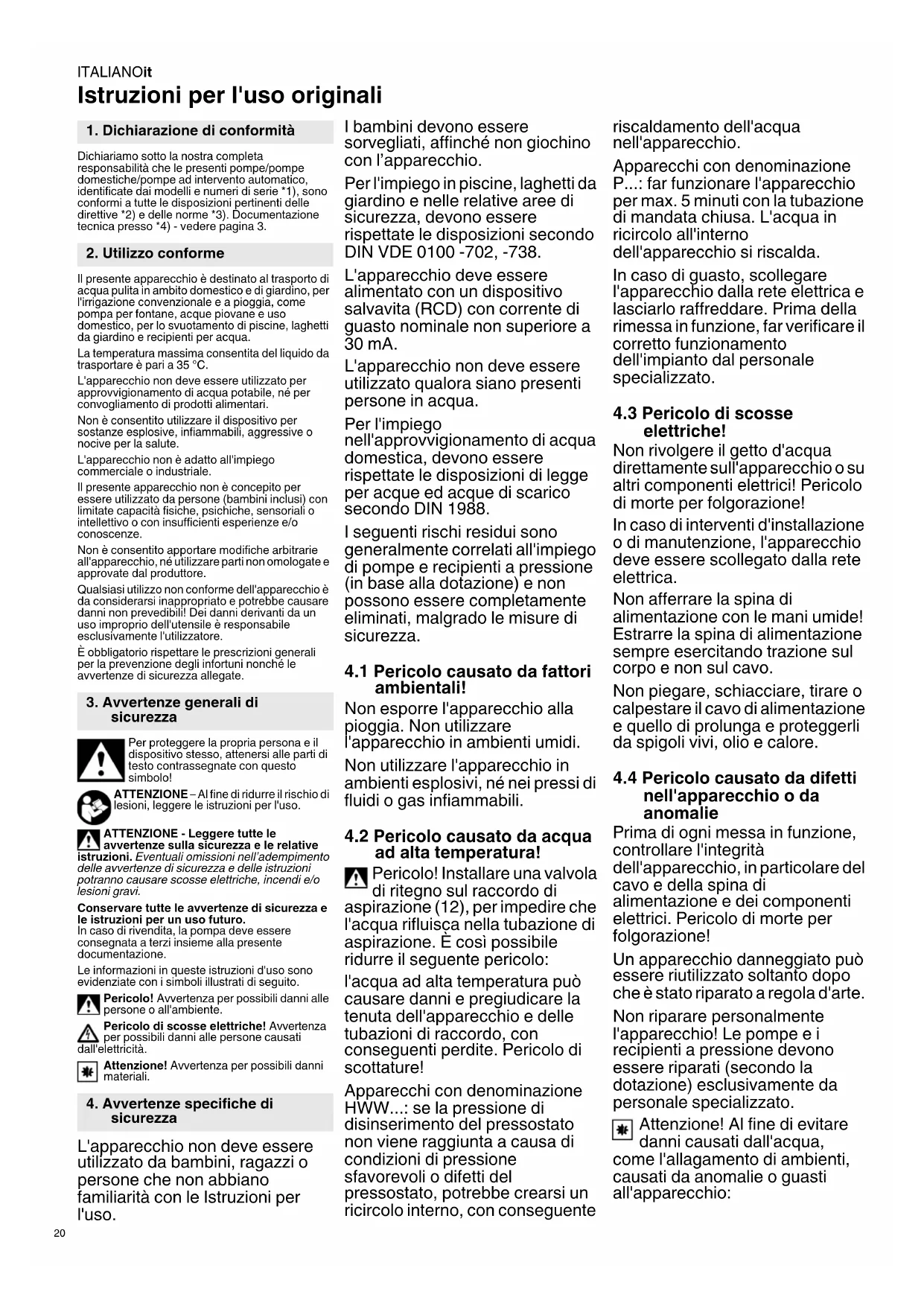 Istruzioni per l'uso originali Dichiariamo sotto la nostra completa responsabilità che le presenti pompe/pompe domestiche/pompe ad intervento automatico, identificate dai modelli e numeri di serie *1), sono conformi a tutte le disposizioni pertinenti delle direttive *2) e delle norme *3). Documentazione tecnica presso *4) - vedere pagina 3. Il presente apparecchio è destinato al trasporto di acqua pulita in ambito domestico e di giardino, per l'irrigazione convenzionale e a pioggia, come pompa per fontane, acque piovane e uso domestico, per lo svuotamento di piscine, laghetti da giardino e recipienti per acqua. La temperatura massima consentita del liquido da trasportare è pari a 35 °C. L'apparecchio non deve essere utilizzato per approvvigionamento di acqua potabile, né per convogliamento di prodotti alimentari. Non è consentito utilizzare il dispositivo per sostanze esplosive, infiammabili, aggressive o nocive per la salute. L'apparecchio non è adatto all'impiego commerciale o industriale. Il presente apparecchio non è concepito per essere utilizzato da persone (bambini inclusi) con limitate capacità fisiche, psichiche, sensoriali o intellettivo o con insufficienti esperienze e/o conoscenze. Non è consentito apportare modifiche arbitrarie all'apparecchio, né utilizzare parti non omologate e approvate dal produttore. Qualsiasi utilizzo non conforme dell'apparecchio è da considerarsi inappropriato e potrebbe causare danni non prevedibili! Dei danni derivanti da un uso improprio dell'utensile è responsabile esclusivamente l'utilizzatore. È obbligatorio rispettare le prescrizioni generali per la prevenzione degli infortuni nonché le avvertenze di sicurezza allegate. Per proteggere la propria persona e il dispositivo stesso, attenersi alle parti di testo contrassegnate con questo simbolo! ATTENZIONE – Al fine di ridurre il rischio di lesioni, leggere le istruzioni per l'uso. ATTENZIONE - Leggere tutte le avvertenze sulla sicurezza e le relative istruzioni. Eventuali omissioni nell’adempimento delle avvertenze di sicurezza e delle istruzioni potranno causare scosse elettriche, incendi e/o lesioni gravi. Conservare tutte le avvertenze di sicurezza e le istruzioni per un uso futuro. In caso di rivendita, la pompa deve essere consegnata a terzi insieme alla presente documentazione. Le informazioni in queste istruzioni d'uso sono evidenziate con i simboli illustrati di seguito. Pericolo! Avvertenza per possibili danni alle persone o all'ambiente. Pericolo di scosse elettriche! Avvertenza per possibili danni alle persone causati dall'elettricità. Attenzione! Avvertenza per possibili danni materiali. L'apparecchio non deve essere utilizzato da bambini, ragazzi o persone che non abbiano familiarità con le Istruzioni per l'uso. I bambini devono essere sorvegliati, affinché non giochino con l’apparecchio. Per l'impiego in piscine, laghetti da giardino e nelle relative aree di sicurezza, devono essere rispettate le disposizioni secondo DIN VDE 0100 -702, -738. L'apparecchio deve essere alimentato con un dispositivo salvavita (RCD) con corrente di guasto nominale non superiore a 30 mA. L'apparecchio non deve essere utilizzato qualora siano presenti persone in acqua. Per l'impiego nell'approvvigionamento di acqua domestica, devono essere rispettate le disposizioni di legge per acque ed acque di scarico secondo DIN 1988. I seguenti rischi residui sono generalmente correlati all'impiego di pompe e recipienti a pressione (in base alla dotazione) e non possono essere completamente eliminati, malgrado le misure di sicurezza.