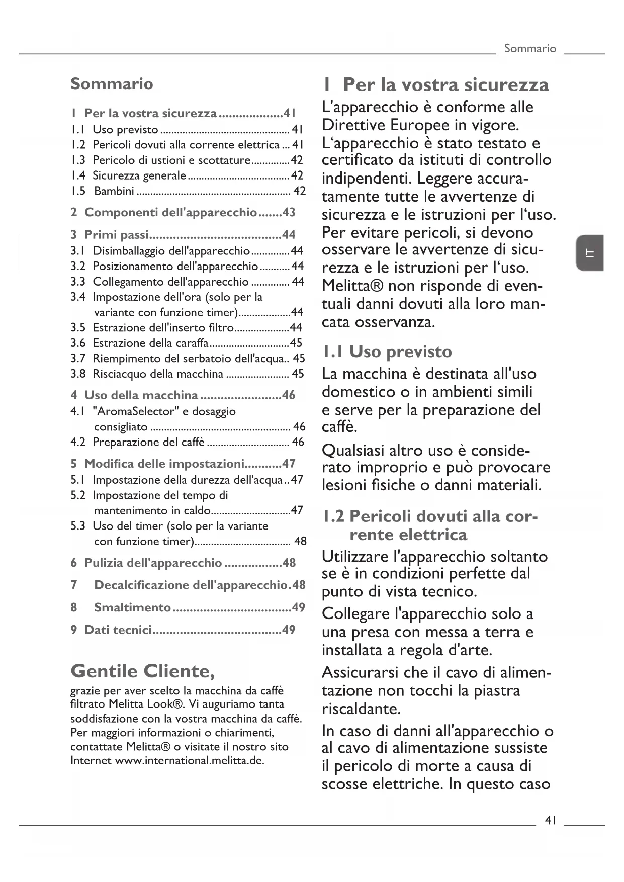rente elettrica Utilizzare l'apparecchio soltanto se è in condizioni perfette dal punto di vista tecnico. Collegare l'apparecchio solo a una presa con messa a terra e installata a regola d'arte. Assicurarsi che il cavo di alimen- tazione non tocchi la piastra riscaldante. In caso di danni all'apparecchio o al cavo di alimentazione sussiste il pericolo di morte a causa di scosse elettriche. In questo caso Gentile Cliente, grazie per aver scelto la macchina da caffè ltrato Melitta Look®. Vi auguriamo tanta soddisfazione con la vostra macchina da caffè. Per maggiori informazioni o chiarimenti, contattate Melitta® o visitate il nostro sito Internet www.international.melitta.de.Per la vostra sicurezza