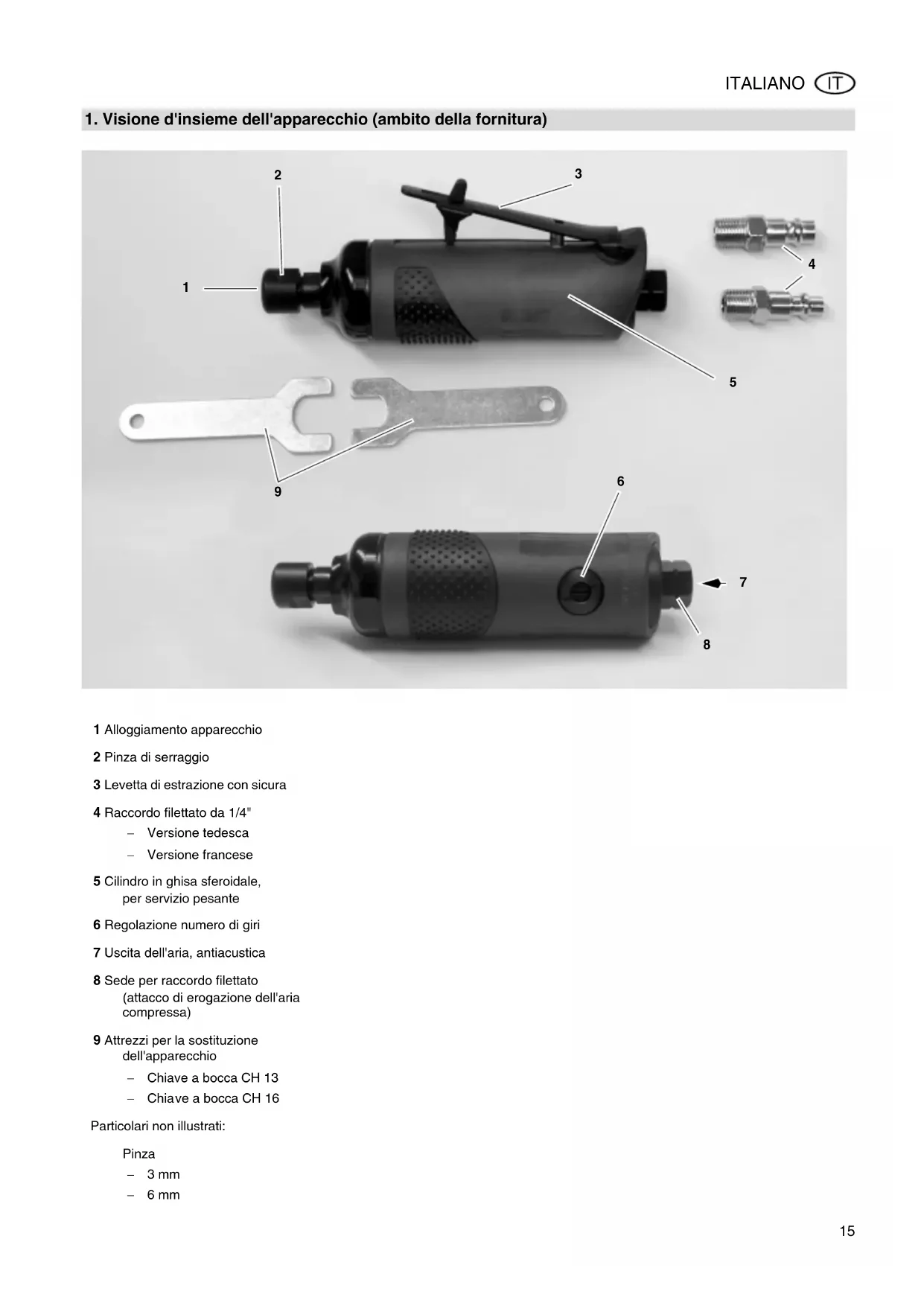 rsione tedesca Versione franc ese 5 Cilindro in ghisa sferoidale, per servizio pesante 6 Regolazione numero di giri 7 Uscita dell'aria, antiacustica 8 Sede per raccordo filettato (attacco di erog azione dell'aria compressa) 9 Attrezzi per la sostituzione