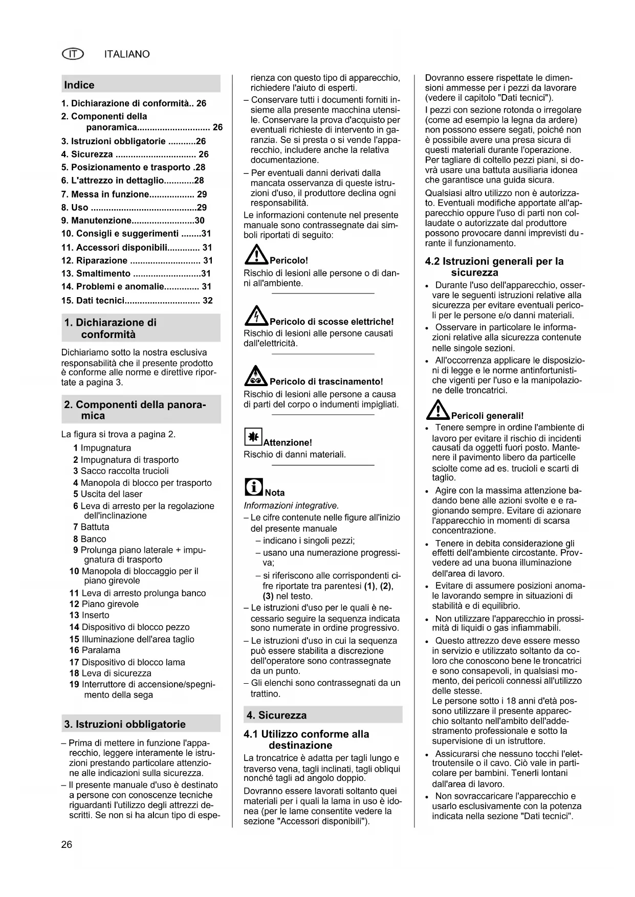 li per le persone e/o danni materiali. Osservare in particolare le informa- zioni relative alla sicurezza contenute nelle singole sezioni. All'occorrenza applicare le disposizio- ni di legge e le norme antinfortunisti- che vigenti per l'uso e la manipolazio- ne delle troncatrici. APericoli generali! Tenere sempre in ordine l'ambiente di lavoro per evitare il rischio di incidenti causati da oggetti fuori posto. Mante- nere il pavimento libero da particelle sciolte come ad es. trucioli e scarti di taglio. Agire con la massima attenzione ba- dando bene alle azioni svolte e e ra- gionando sempre. Evitare di azionare l'apparecchio in momenti di scarsa concentrazione. Tenere in debita considerazione gli effetti dell'ambiente circostante. Prov