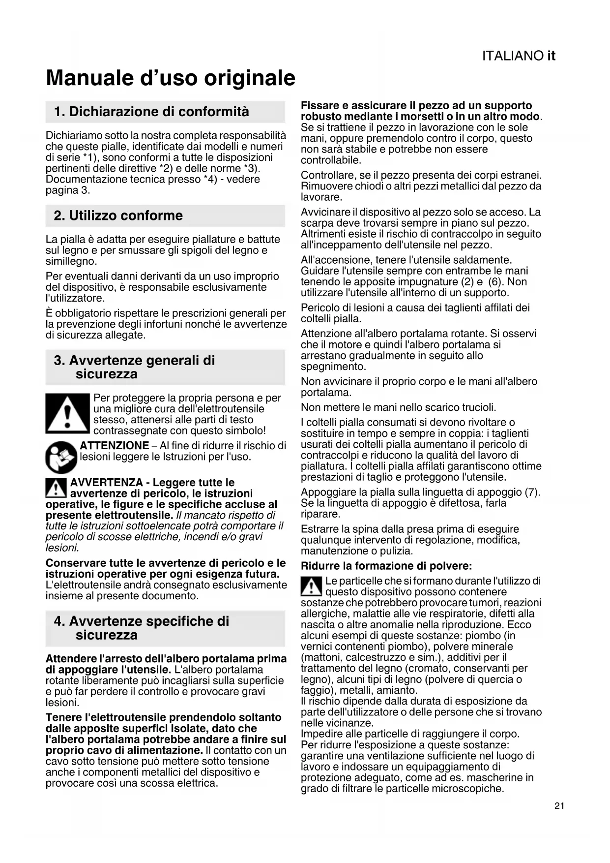 Manuale d’uso originale Dichiariamo sotto la nostra completa responsabilità che queste pialle, identificate dai modelli e numeri di serie *1), sono conformi a tutte le disposizioni pertinenti delle direttive *2) e delle norme *3). Documentazione tecnica presso *4) - vedere pagina 3. La pialla è adatta per eseguire piallature e battute sul legno e per smussare gli spigoli del legno e simillegno. Per eventuali danni derivanti da un uso improprio del dispositivo, è responsabile esclusivamente l'utilizzatore. È obbligatorio rispettare le prescrizioni generali per la prevenzione degli infortuni nonché le avvertenze di sicurezza allegate. Per proteggere la propria persona e per una migliore cura dell'elettroutensile stesso, attenersi alle parti di testo contrassegnate con questo simbolo! ATTENZIONE – Al fine di ridurre il rischio di lesioni leggere le Istruzioni per l'uso. AVVERTENZA - Leggere tutte le avvertenze di pericolo, le istruzioni operative, le figure e le specifiche accluse al presente elettroutensile. Il mancato rispetto di tutte le istruzioni sottoelencate potrà comportare il pericolo di scosse elettriche, incendi e/o gravi lesioni. Conservare tutte le avvertenze di pericolo e le istruzioni operative per ogni esigenza futura. L'elettroutensile andrà consegnato esclusivamente insieme al presente documento. Attendere l'arresto dell'albero portalama prima di appoggiare l'utensile. L'albero portalama rotante liberamente può incagliarsi sulla superficie e può far perdere il controllo e provocare gravi lesioni. Tenere l'elettroutensile prendendolo soltanto dalle apposite superfici isolate, dato che l'albero portalama potrebbe andare a finire sul proprio cavo di alimentazione. Il contatto con un cavo sotto tensione può mettere sotto tensione anche i componenti metallici del dispositivo e provocare così una scossa elettrica. Fissare e assicurare il pezzo ad un supporto robusto mediante i morsetti o in un altro modo. Se si trattiene il pezzo in lavorazione con le sole mani, oppure premendolo contro il corpo, questo non sarà stabile e potrebbe non essere controllabile. Controllare, se il pezzo presenta dei corpi estranei. Rimuovere chiodi o altri pezzi metallici dal pezzo da lavorare. Avvicinare il dispositivo al pezzo solo se acceso. La scarpa deve trovarsi sempre in piano sul pezzo. Altrimenti esiste il rischio di contraccolpo in seguito all'inceppamento dell'utensile nel pezzo. All'accensione, tenere l'utensile saldamente. Guidare l'utensile sempre con entrambe le mani tenendo le apposite impugnature (2) e (6). Non utilizzare l'utensile all'interno di un supporto. Pericolo di lesioni a causa dei taglienti affilati dei coltelli pialla. Attenzione all'albero portalama rotante. Si osservi che il motore e quindi l'albero portalama si arrestano gradualmente in seguito allo spegnimento. Non avvicinare il proprio corpo e le mani all'albero portalama. Non mettere le mani nello scarico trucioli. I coltelli pialla consumati si devono rivoltare o sostituire in tempo e sempre in coppia: i taglienti usurati dei coltelli pialla aumentano il pericolo di contraccolpi e riducono la qualità del lavoro di piallatura. I coltelli pialla affilati garantiscono ottime prestazioni di taglio e proteggono l'utensile. Appoggiare la pialla sulla linguetta di appoggio (7). Se la linguetta di appoggio è difettosa, farla riparare. Estrarre la spina dalla presa prima di eseguire qualunque intervento di regolazione, modifica, manutenzione o pulizia. Ridurre la formazione di polvere: Le particelle che si formano durante l'utilizzo di questo dispositivo possono contenere sostanze che potrebbero provocare tumori, reazioni allergiche, malattie alle vie respiratorie, difetti alla nascita o altre anomalie nella riproduzione. Ecco alcuni esempi di queste sostanze: piombo (in vernici contenenti piombo), polvere minerale (mattoni, calcestruzzo e sim.), additivi per il trattamento del legno (cromato, conservanti per legno), alcuni tipi di legno (polvere di quercia o faggio), metalli, amianto. Il rischio dipende dalla durata di esposizione da parte dell'utilizzatore o delle persone che si trovano nelle vicinanze. Impedire alle particelle di raggiungere il corpo. Per ridurre l'esposizione a queste sostanze: garantire una ventilazione sufficiente nel luogo di lavoro e indossare un equipaggiamento di protezione adeguato, come ad es. mascherine in grado di filtrare le particelle microscopiche.