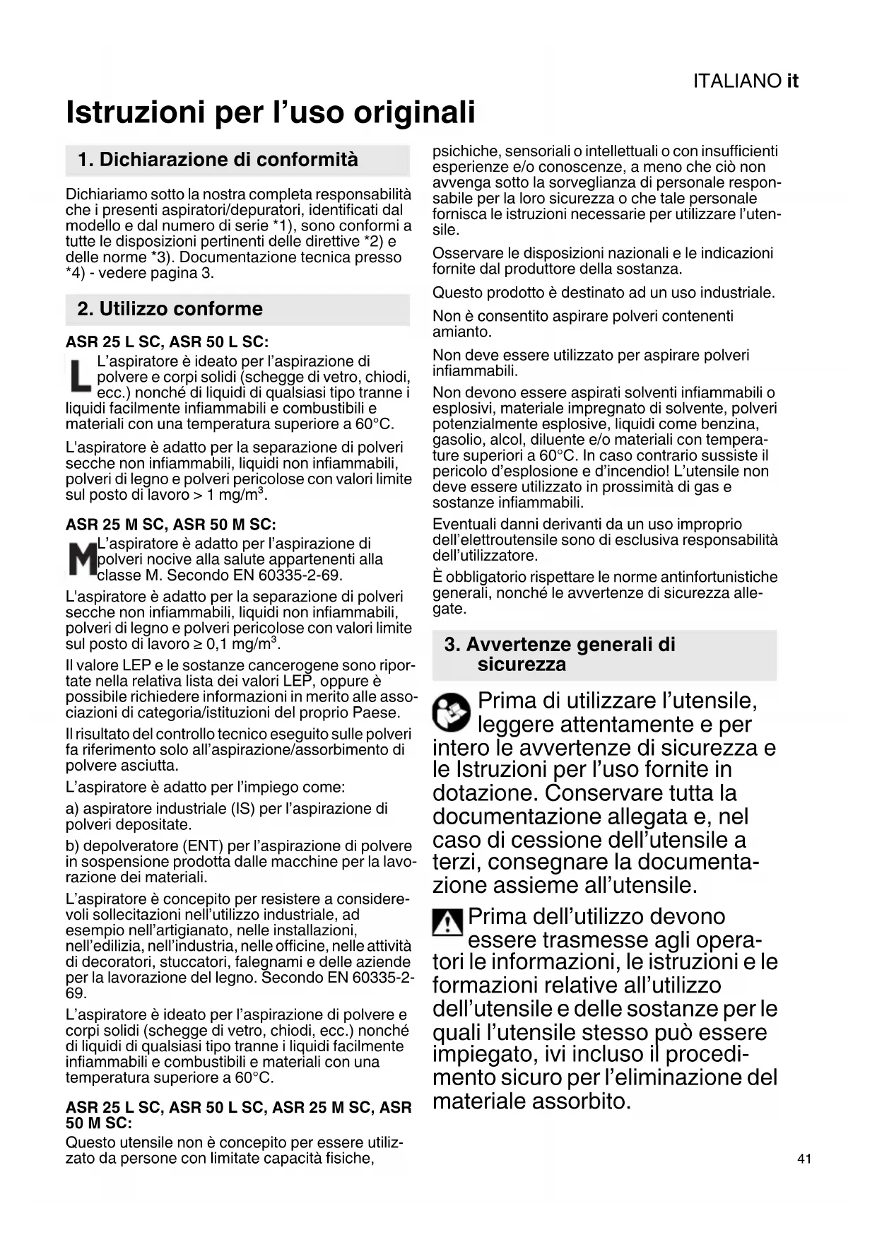 Istruzioni per l’uso originali Dichiariamo sotto la nostra completa responsabilità che i presenti aspiratori/depuratori, identificati dal modello e dal numero di serie *1), sono conformi a tutte le disposizioni pertinenti delle direttive *2) e delle norme *3). Documentazione tecnica presso *4) - vedere pagina 3. ASR 25 L SC, ASR 50 L SC: L’aspiratore è ideato per l’aspirazione di polvere e corpi solidi (schegge di vetro, chiodi, ecc.) nonché di liquidi di qualsiasi tipo tranne i liquidi facilmente infiammabili e combustibili e materiali con una temperatura superiore a 60°C. L'aspiratore è adatto per la separazione di polveri secche non infiammabili, liquidi non infiammabili, polveri di legno e polveri pericolose con valori limite sul posto di lavoro > 1 mg/m³. ASR 25 M SC, ASR 50 M SC: L’aspiratore è adatto per l’aspirazione di polveri nocive alla salute appartenenti alla classe M. Secondo EN 60335-2-69. L'aspiratore è adatto per la separazione di polveri secche non infiammabili, liquidi non infiammabili, polveri di legno e polveri pericolose con valori limite sul posto di lavoro ≥ 0,1 mg/m³. Il valore LEP e le sostanze cancerogene sono ripor- tate nella relativa lista dei valori LEP, oppure è possibile richiedere informazioni in merito alle asso- ciazioni di categoria/istituzioni del proprio Paese. Il risultato del controllo tecnico eseguito sulle polveri fa riferimento solo all’aspirazione/assorbimento di polvere asciutta. L’aspiratore è adatto per l’impiego come: a) aspiratore industriale (IS) per l’aspirazione di polveri depositate. b) depolveratore (ENT) per l’aspirazione di polvere in sospensione prodotta dalle macchine per la lavo- razione dei materiali. L’aspiratore è concepito per resistere a considere- voli sollecitazioni nell’utilizzo industriale, ad esempio nell’artigianato, nelle installazioni, nell’edilizia, nell’industria, nelle officine, nelle attività di decoratori, stuccatori, falegnami e delle aziende per la lavorazione del legno. Secondo EN 60335-2-